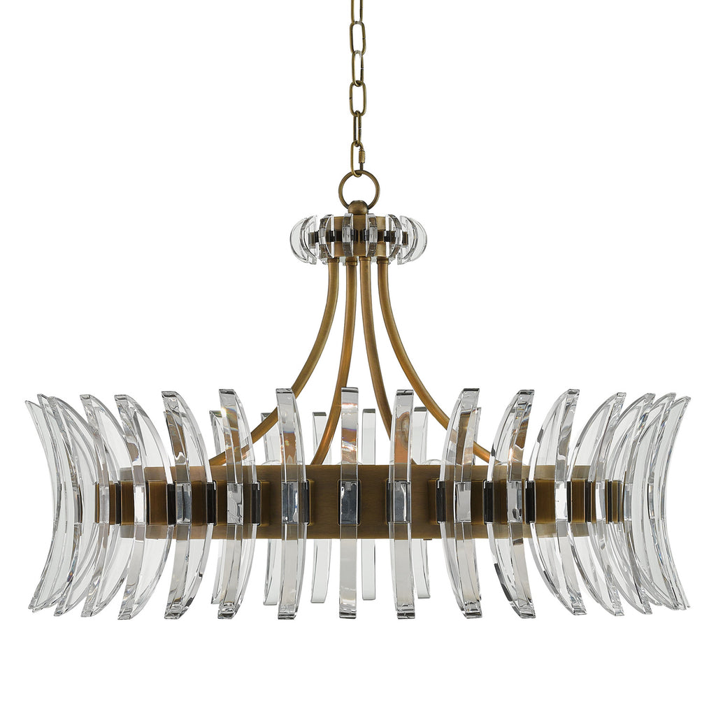 The Coquette Chandelier is a modern iteration of Art Deco artistry that intermingles the brilliance of slices of optic crystal and the depth of metal that has been treated to an antique brass finish. The crystal blades that line the round fixture read like half-moon slivers to bring the chandelier a warm/cool sense of glamour. The eight-light chandelier would bring a sophisticated sense of luxury to any number of rooms in the well-appointed home.