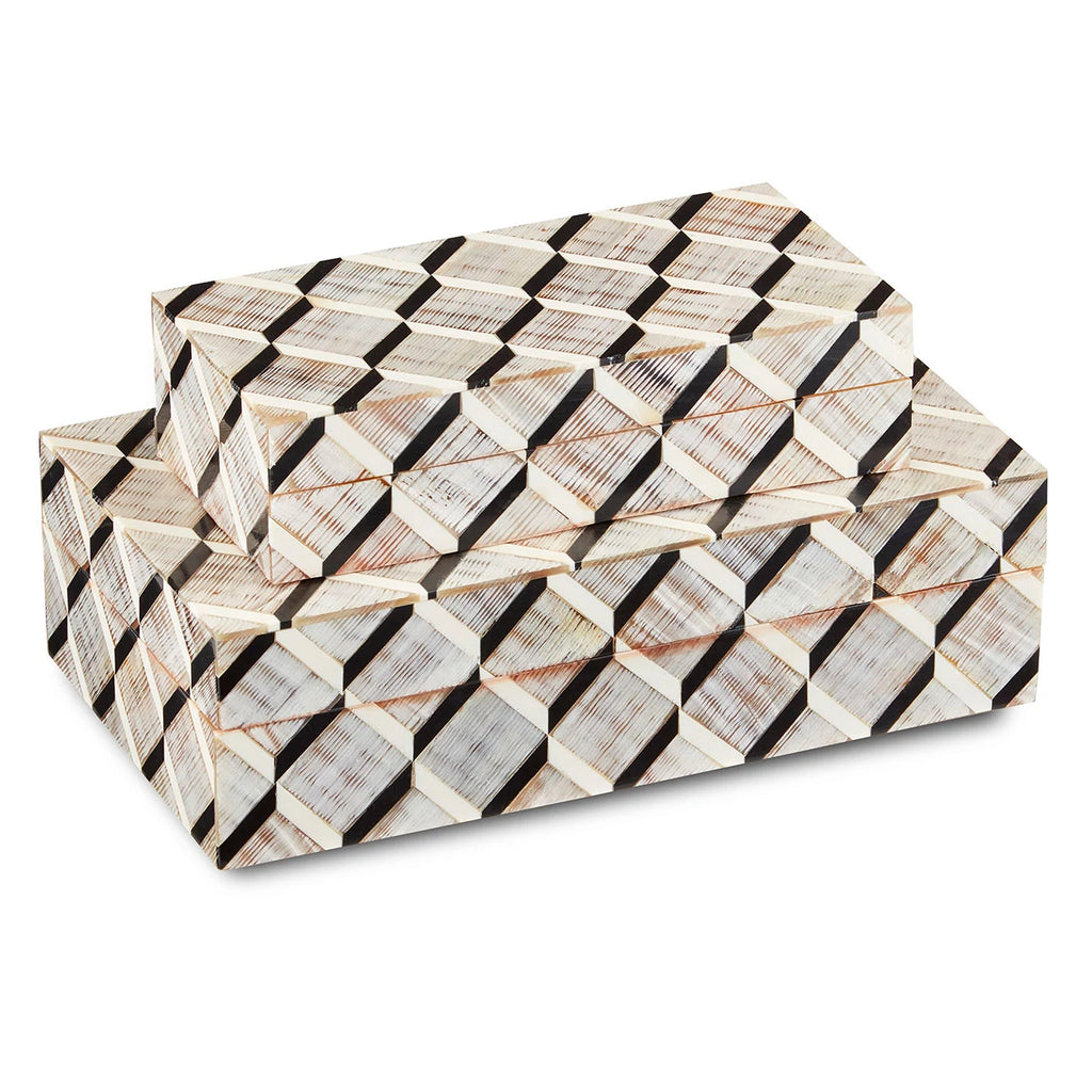 Mixing chiseled horn with composite brings the Currey & Co Derian Box Set a nice luminous texture. The striations on the surfaces of the pair of decorative boxes, which nest inside each other, are achieved when artisans take chisels and put them on angle as they are hammering the lines into the surface of the horn. The black and white diamond shapes are clean, contrasting elements. Sold as set of two.