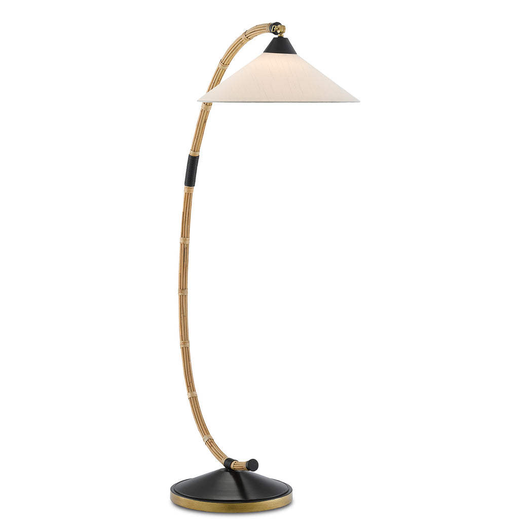 A nod to one of the world’s seafaring port cities, the Currey & Company Lisbon floor lamp, which is made of wrought iron in new brass and satin black finishes, has a stem covered in rattan to bring a nautical feel to its character. Several design notes worth mentioning on this rattan floor lamp are the curvature of the stem that has several sections wrapped horizontally in black, the shape of and details on the off-white linen shade, and the black finish at the top of the base.