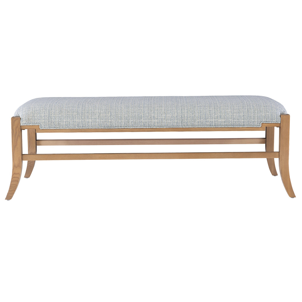 The Melanie Blonde Bench is made of ash wood in a blonde ash-wood finish; the slanting legs and the stepped details where the upholstery meets the wood on the seat are reminiscent of Greek stylistic leanings. These aspects of the bench bring it added personality. The seat is covered in a Greenlight Powder performance fabric that has a textural feel.