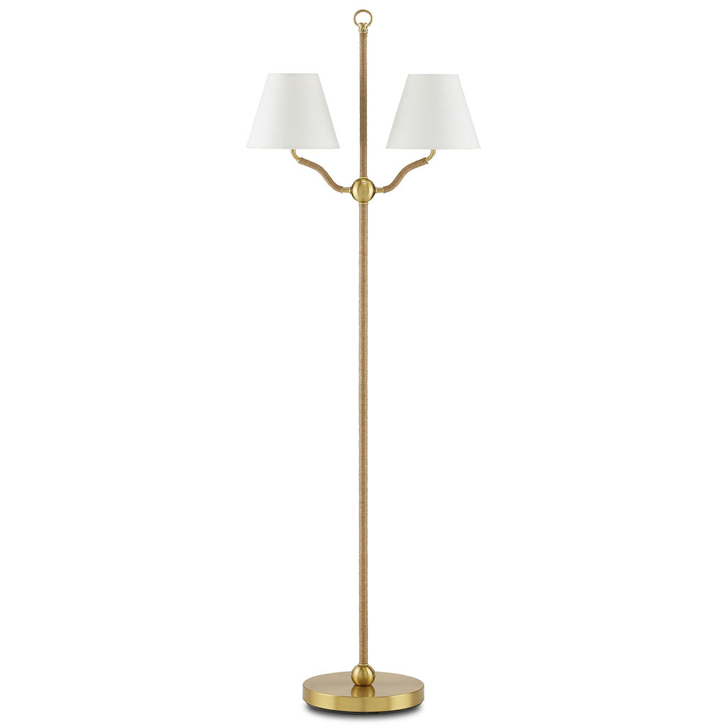 Tom Caldwell created a light profile for the Currey & Co Sirocco Floor Lamp and wrapped all but the main decorative elements in jute rope. These include the ring at its apex, the small globes at its base and the one connecting the forked arms, and the base itself. Made of steel and natural plated antique brass, the rope floor lamp is fitted with two off-white linen shades. This is a petite floor lamp designed to be a decorative accent in a space.