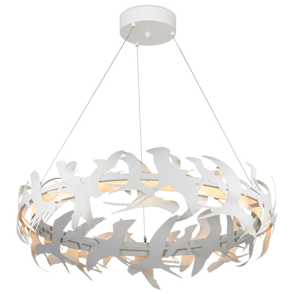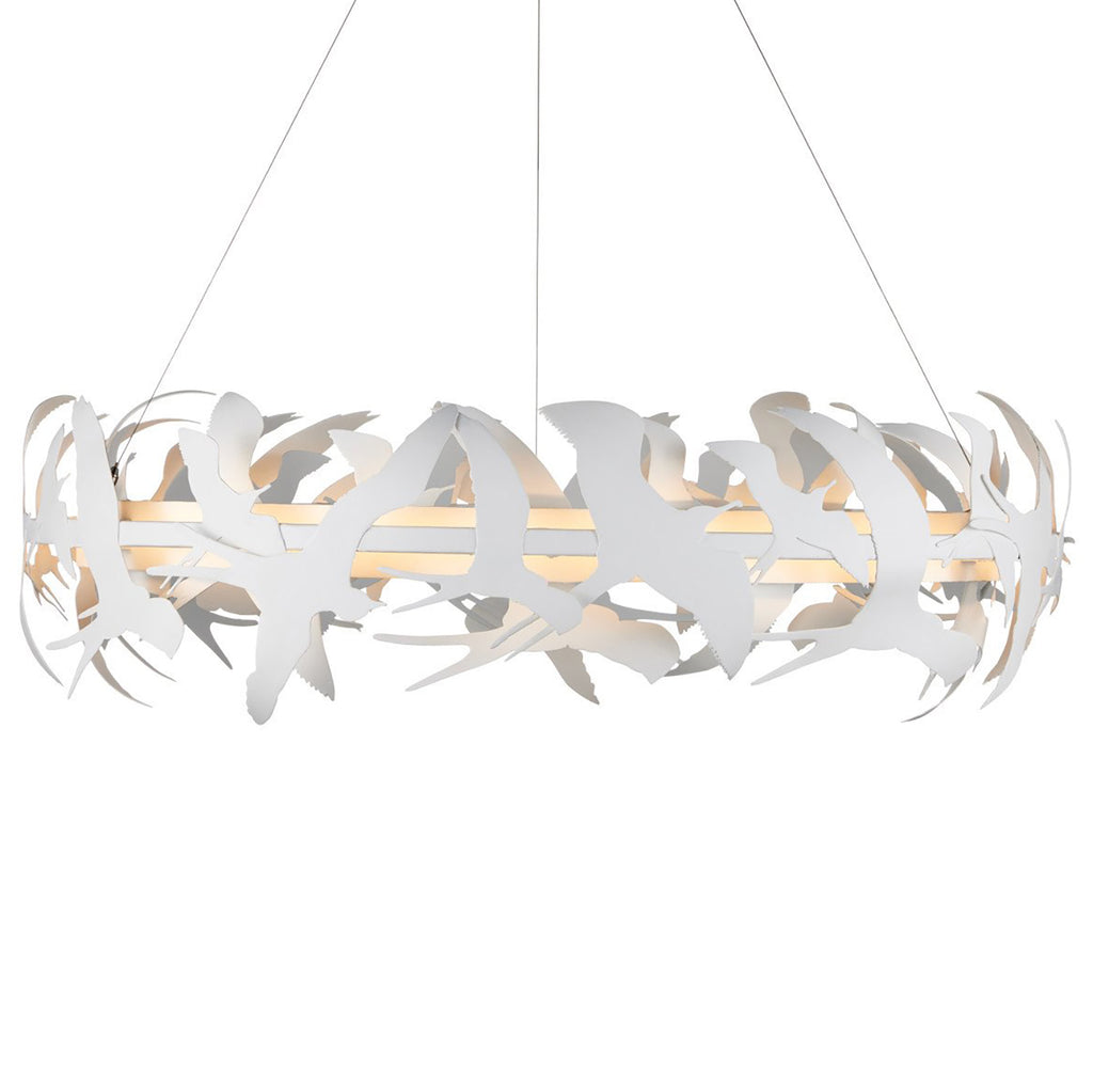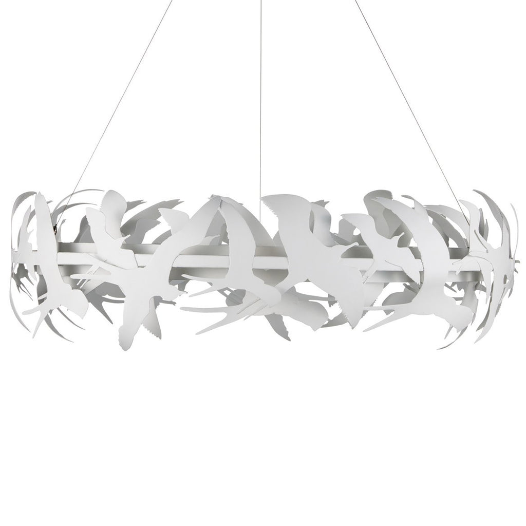 New to the Marjorie Skouras Collection, the Tijereta White Chandelier pays homage to the Fork-tailed Flycatcher, a nimble bird with an elegant scissor tail. This is one more creation that illustrates Skouras's ability to translate the natural world of the Yucatan Peninsula into beautiful design elements. The circular chandelier seems to float, as birds do, given it is hanging from aircraft cable.
