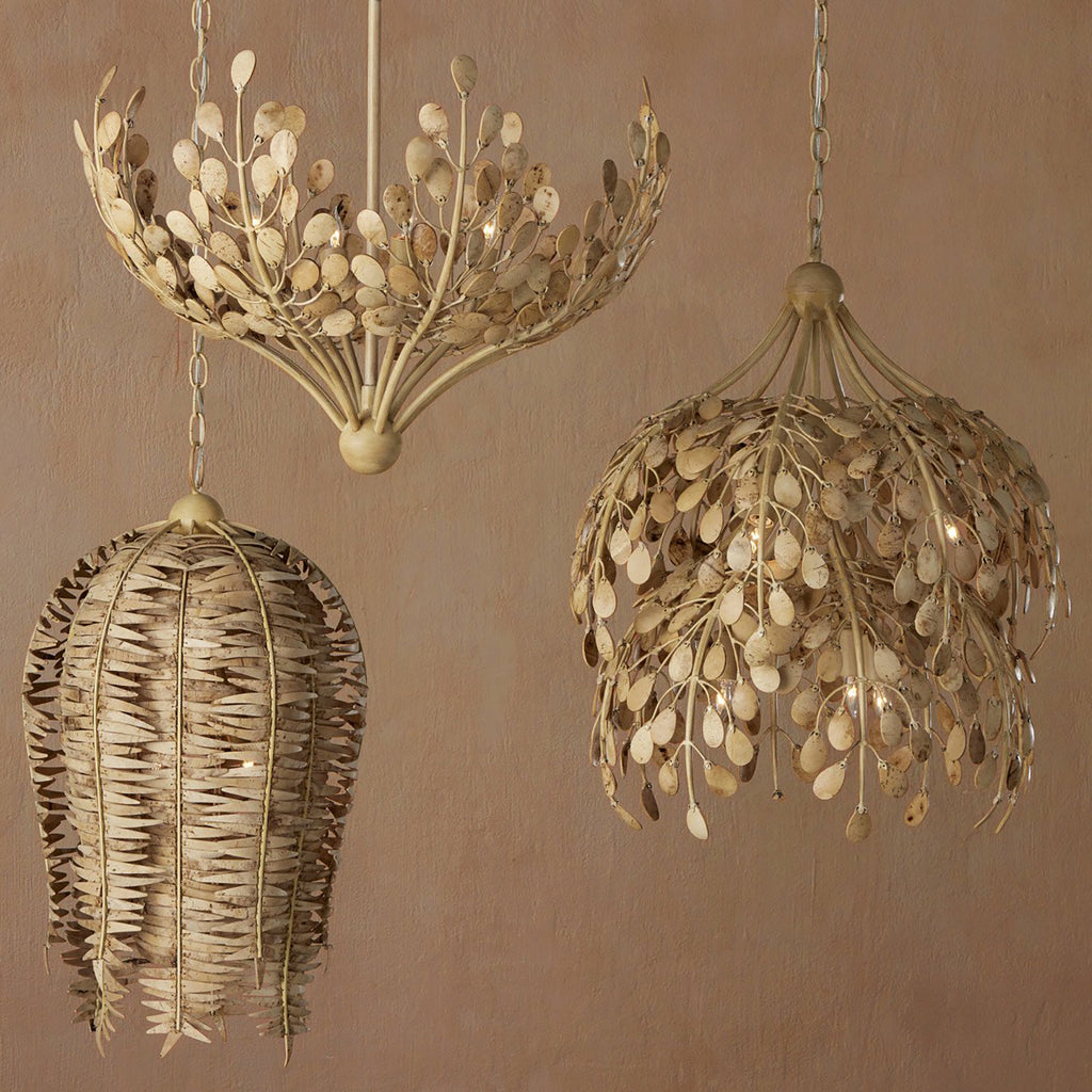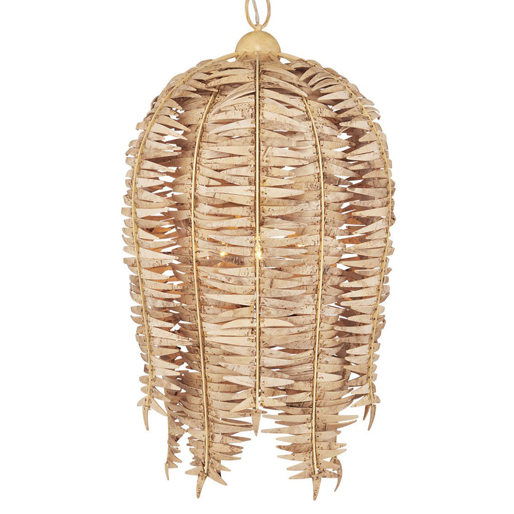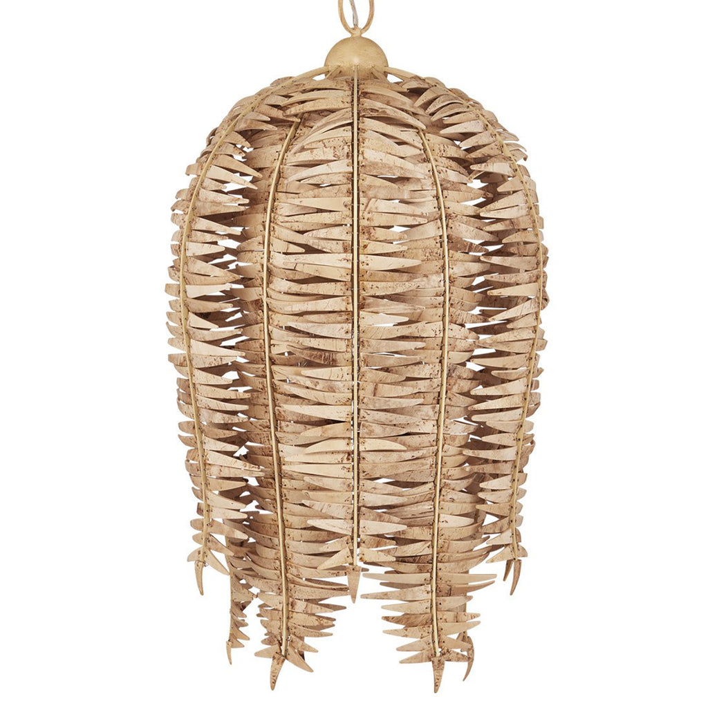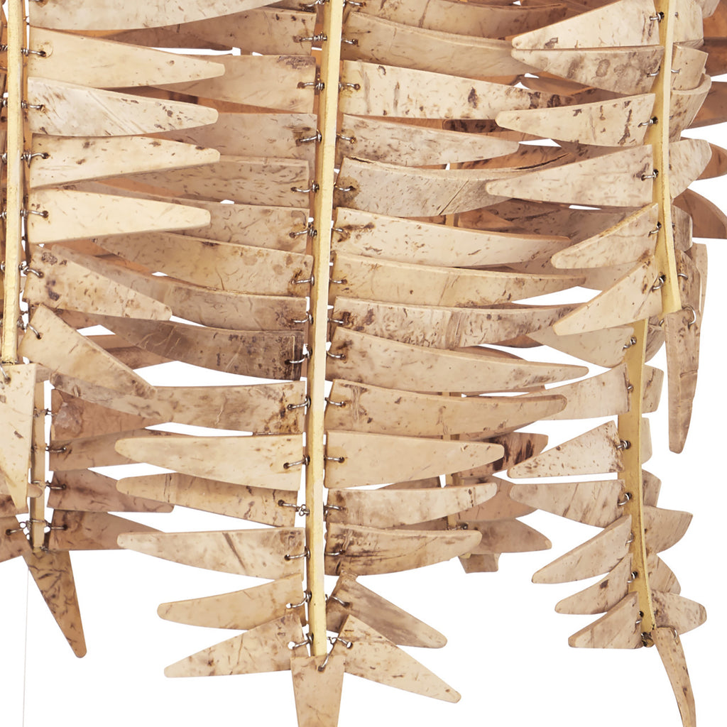 A tremendous amount of effort goes into creating the Currey & Co Tiptur Pendant, as the coconut shells are cut, bleached, drilled, and pinned to the frame by hand to form its bell shape. Tied to thin ribs of wrought iron in a coco cream finish, the color of the shells blends beautifully with the metal to create a veritable work of art.