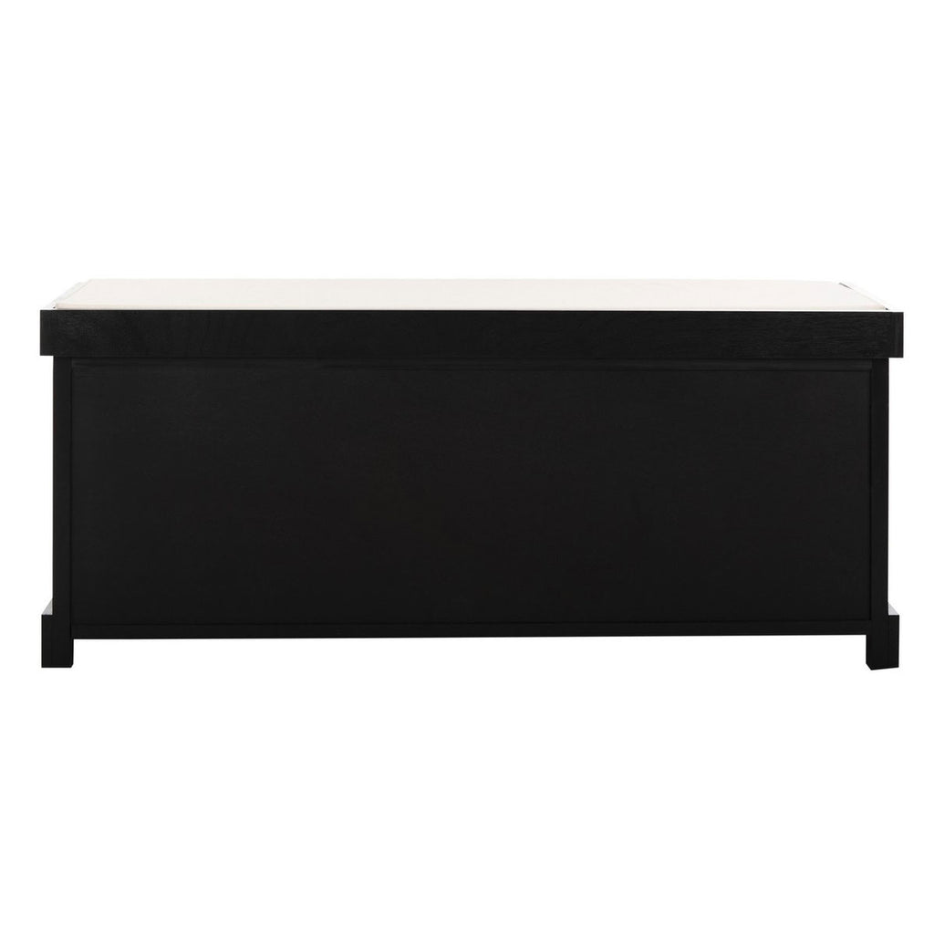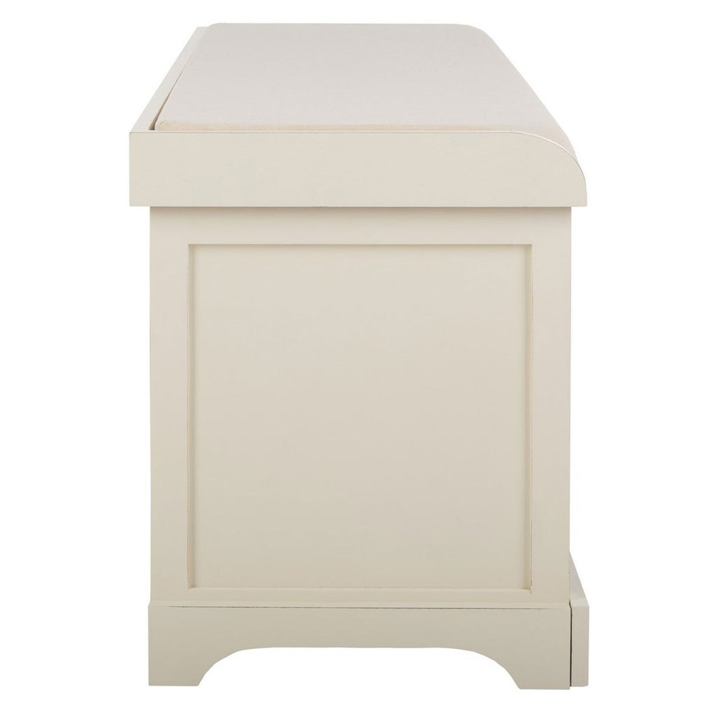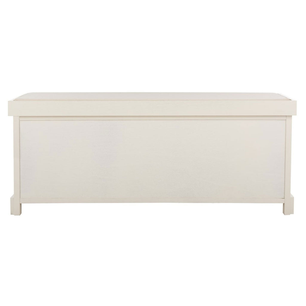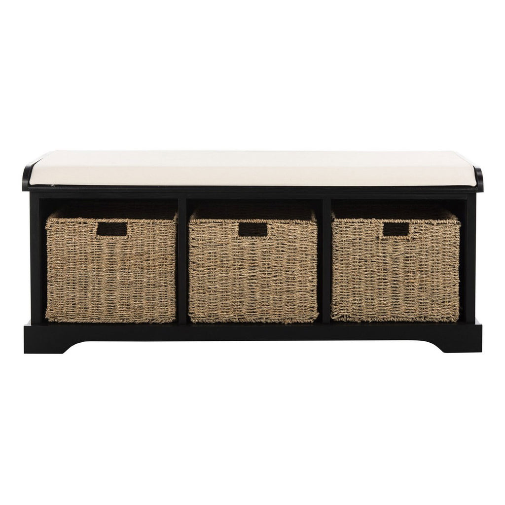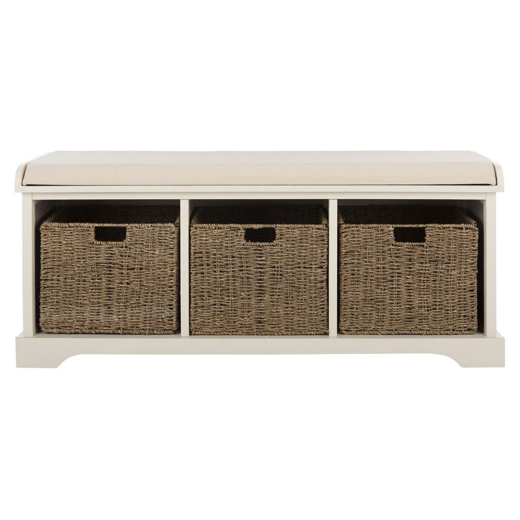 This storage bench is the perfect perch for removing boots or garden shoes in an entry hall. Crafted of pine in a handsome grey finish, this useful piece has three removable storage bins of woven rattan and a flip-top seat covered in white cotton.