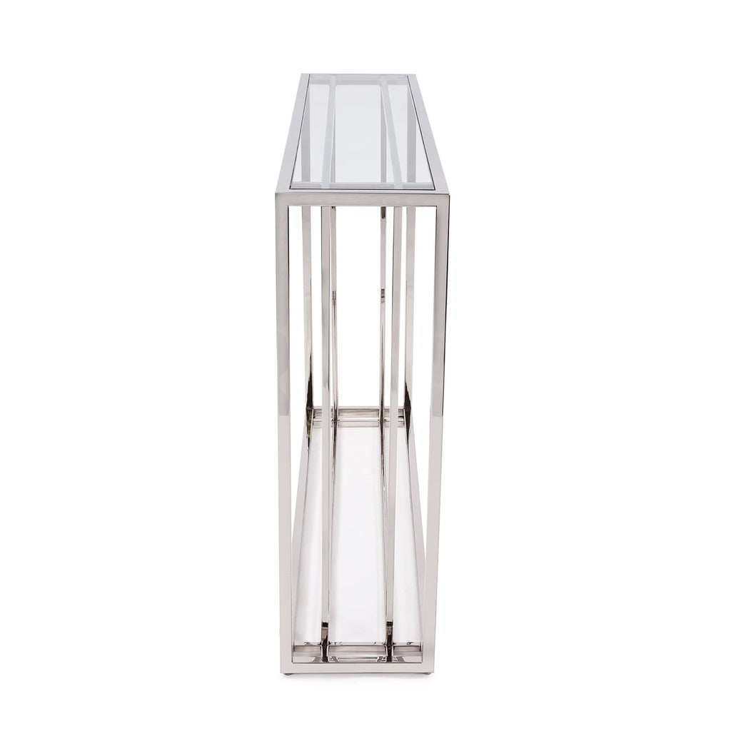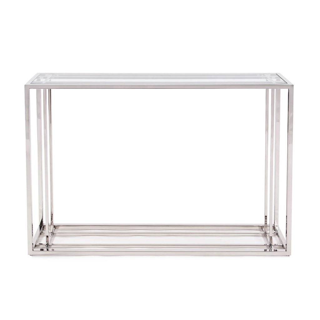 Parallel lines of polished stainless steel echo each other in the simple design of our Echo Console Table. The Console Table features linear rods of polished stainless steel. The frame holds a clear tempered glass top. The collection also includes a tall pedestal table, sold separately. Pair them together to complete the look.