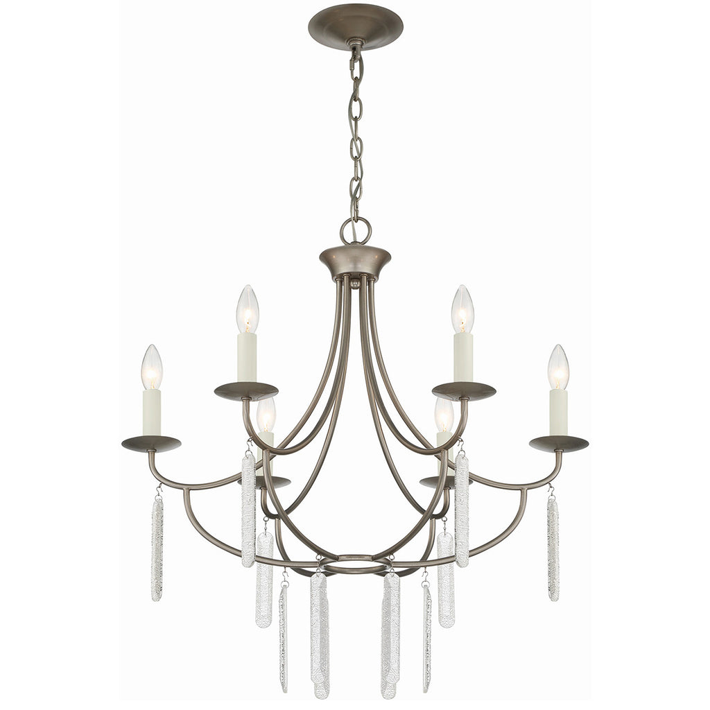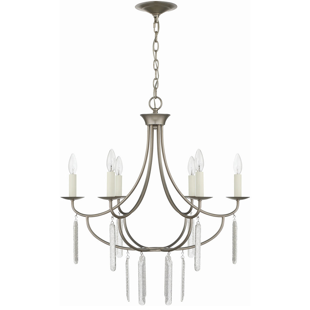A study in feminine refinement, this classically inspired ceiling fixture is finished in hand-painted silver and completed with oblong crystal droplets. These crystals add elegance, but the modern shape keep them from being too traditional. The elegant Arwen Chandelier would be lovely in a dining room or foyer, and at 26 inches in diameter, has the scale to make a beautiful statement. The six lights are dimmable for added versatility. Includes a 6-foot chain to adjust height and an extra crystal drop.