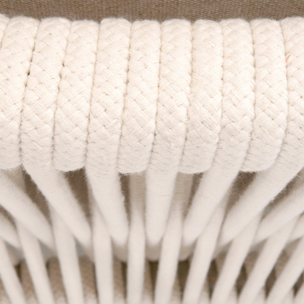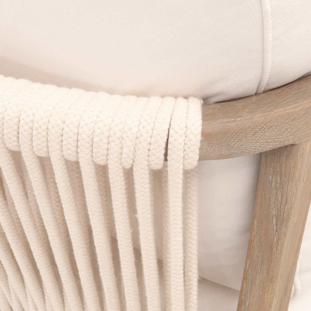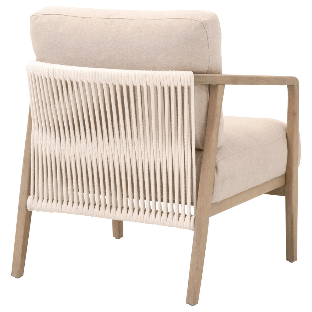 The Harbor club chair in transitional style featuring an intricate rope weave designed back, 100% linen upholstery, and a solid oak frame.