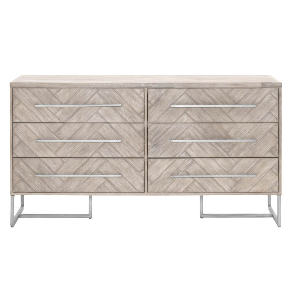 The Essentials for Living Mosaic double dresser in transitional style featuring six storage drawers with Herringbone pattern and finish options. The Acacia Veneer finish is sandblasted to create a rustic appearance. This process accentuates the natural grain of the wood and creates a variation in both color and texture. The existence of natural knots, cracks, scratches, and marks in the surface of the wood should be expected.
