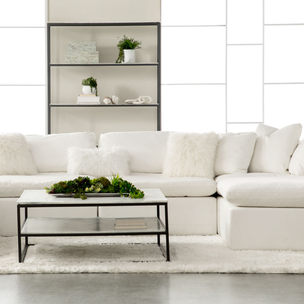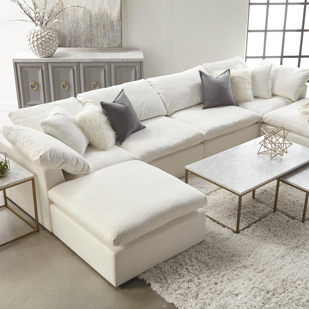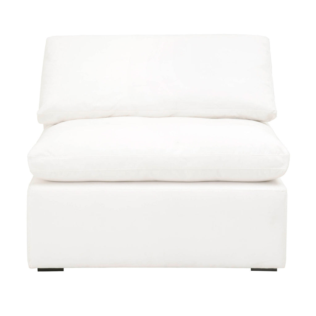 Add transitional style to your living room, family room, or den with the Essentials for Living Sky modular armless chair in Livesmart Peyton-Pearl fabric. With the seat cushion made of half down and half polyester, this chair is extremely comfortable to curl up and read a book or watch television on. It features reversible seat and back cushions, as well as ties to prevent the cushions from moving. Constructed with 3.8" coil sinuous springs and stain resistant fabric, this chair is meant for durability and dependability. Pairs nicely with sectional sofas and works great as additional seating.