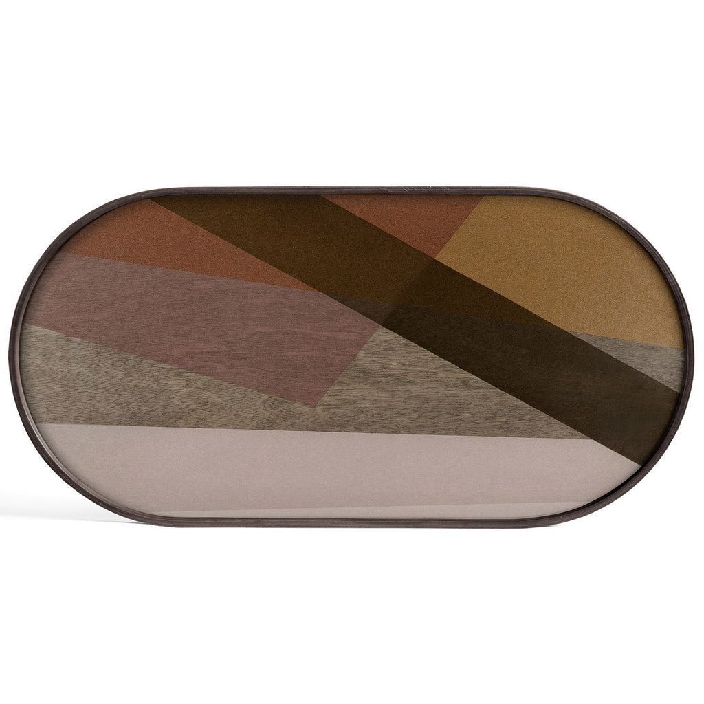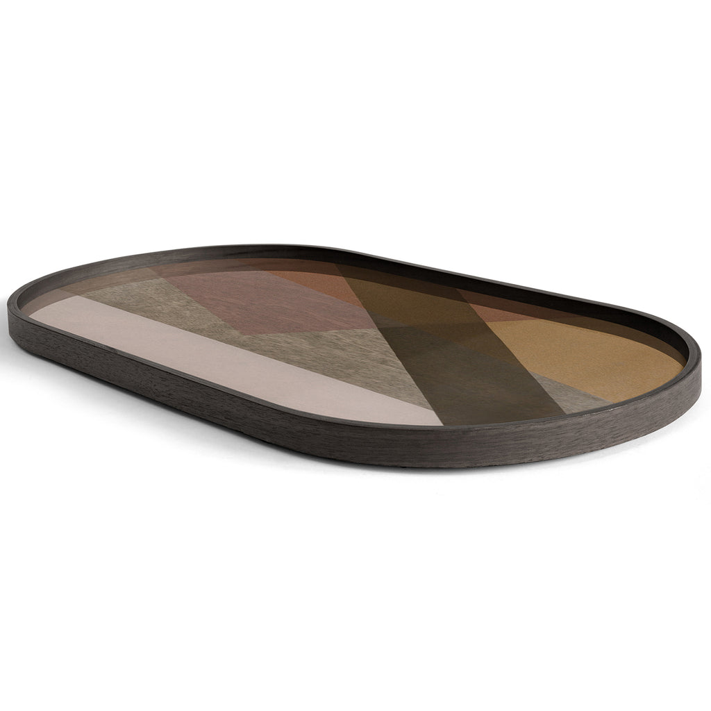 Overlapping shapes and colours create the tranquil rhythm in the Ethnicraft Composed Angles collection. Featuring a layered composition, the screen-printed glass design features translucent and opaque layers that seem to define the next, creating an unexpected harmony. Designed by Dawn Sweitzer, each tray fits perfectly with a tray table, or rests nicely on a tabletop or shelving.