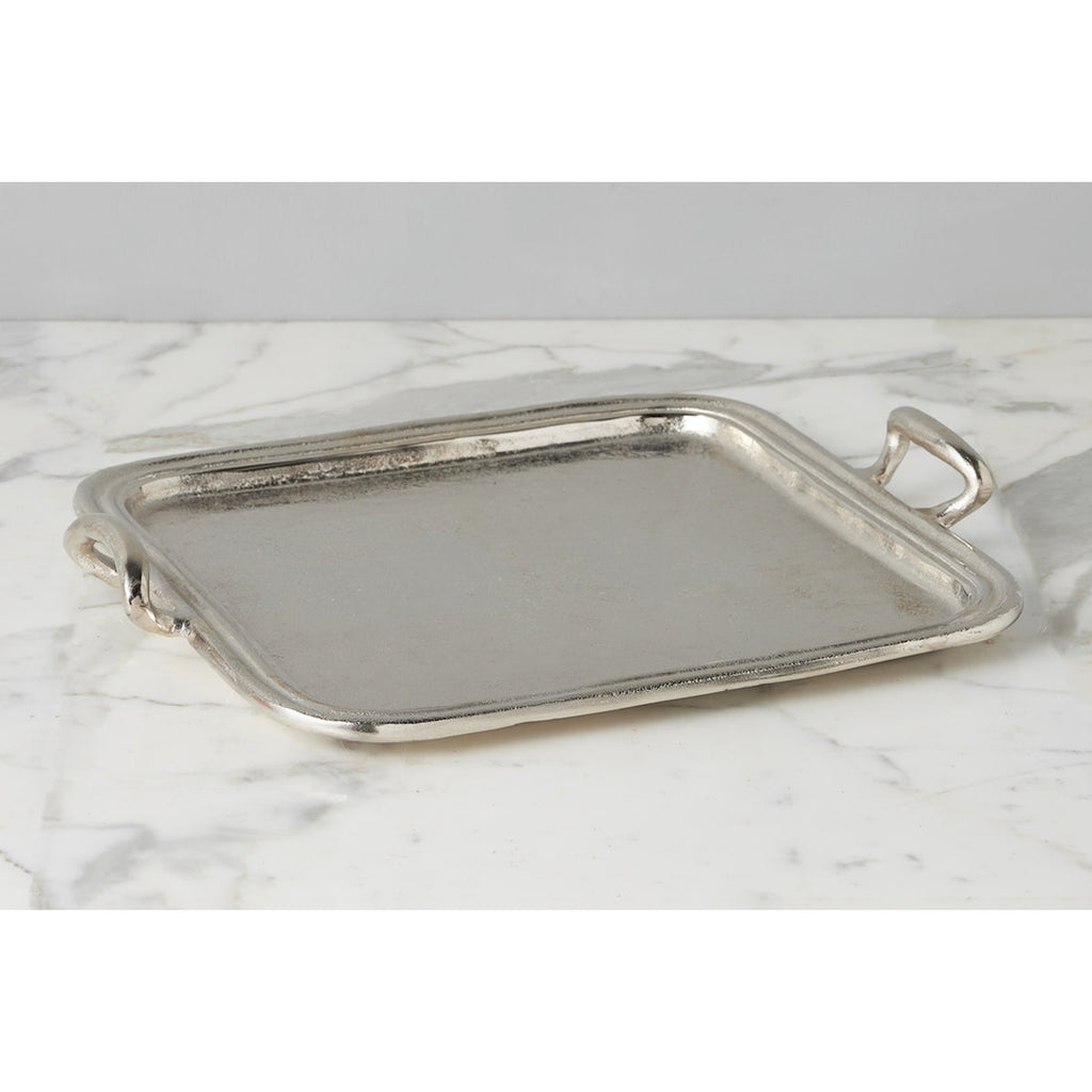 Introducing the Silver Square Hotel Tray, perfect for adding a touch of elegance and sophistication to any room. Inspired by vintage trays used in luxe European hotels, this versatile metal accent will elevate ottomans, coffee tables, consoles and even the at-home bar. Its generous surface space allows for a statement display of your favorite decorative accents.