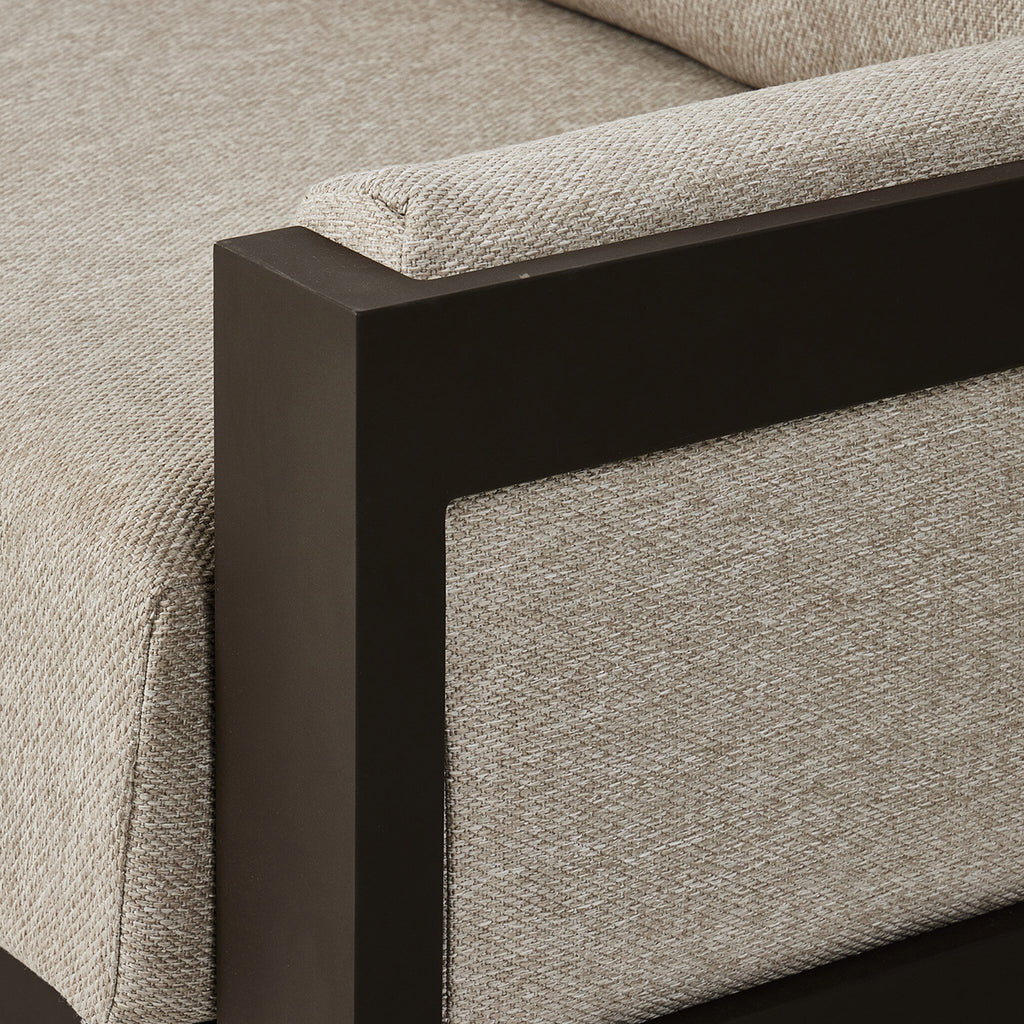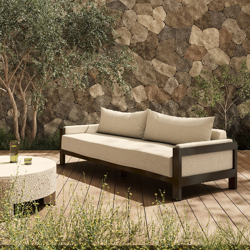 Framed by bronze metal with wide proportions and soft, thick cushioning for effortless comfort designed for outdoor lounging. Light upholstery and minimalist form makes this an easy outdoor sofa to move between different styles and settings. Cover or store inside during inclement weather and when not in use.