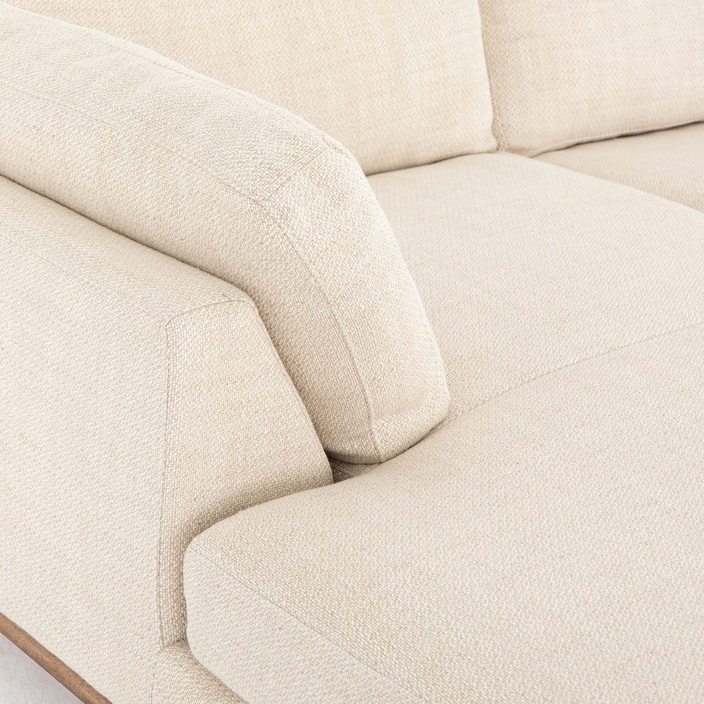 Classic goes contemporary. A cocoa-finished parawood base supports low, deep seating of performance-grade upholstery in an invitingly neutral taupe, with track arms for a clean touch. Left arm facing two-piece sectional.