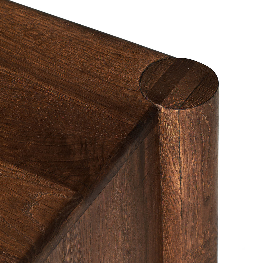 Grain and character variation of cocoa-finished oak craft an intriguingly organic look. The carved design and floor-to-top cylinder legs give a primitive look that balances the movement of the wood pattern.