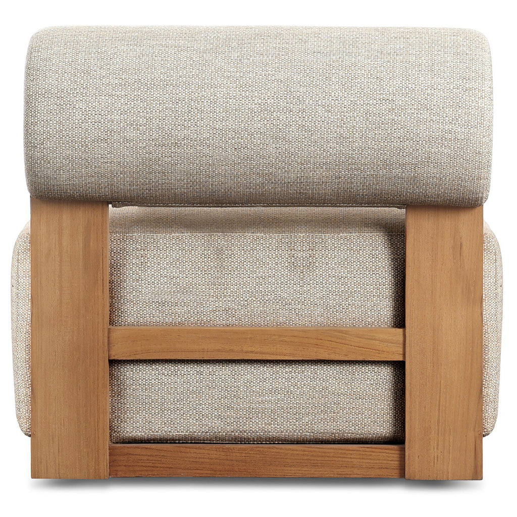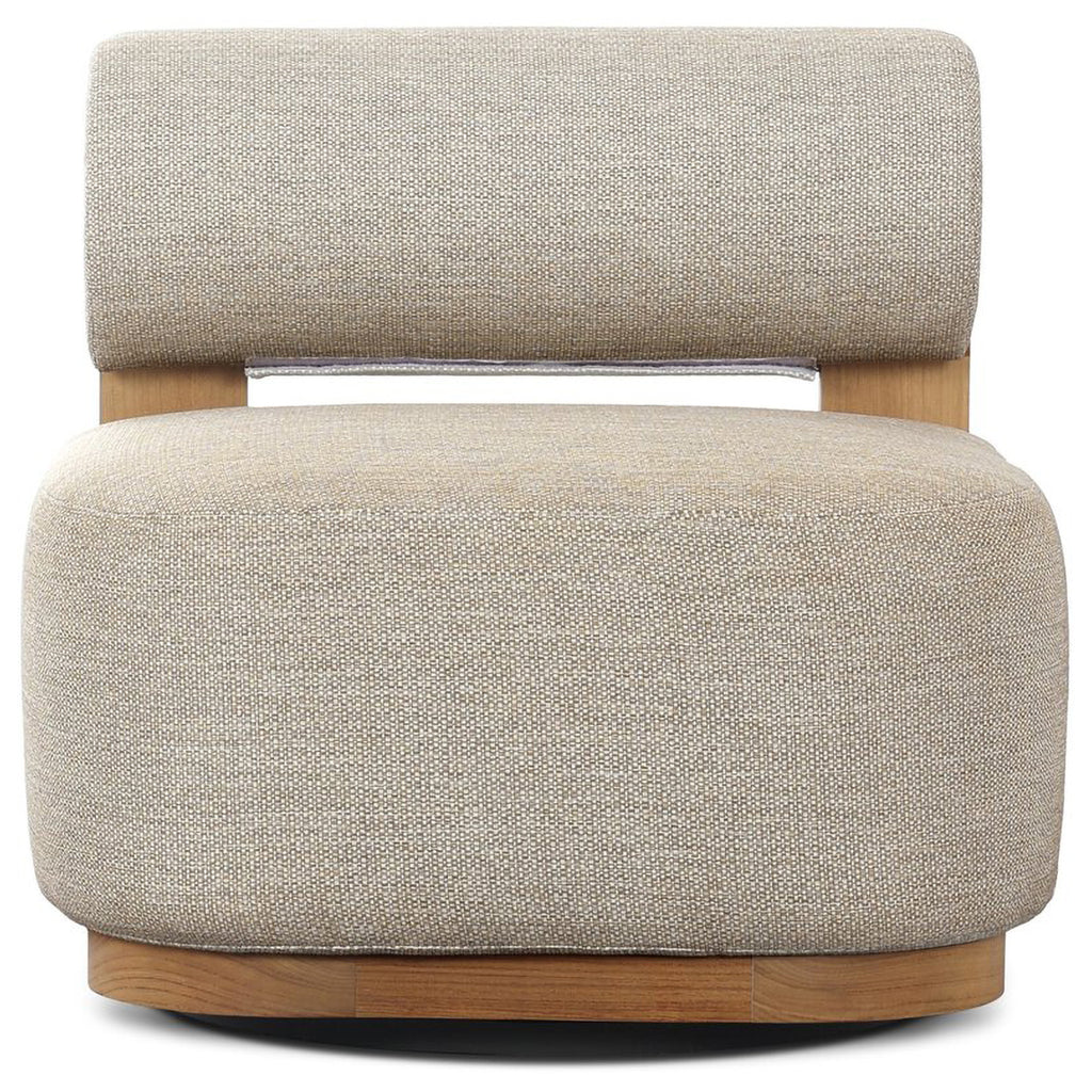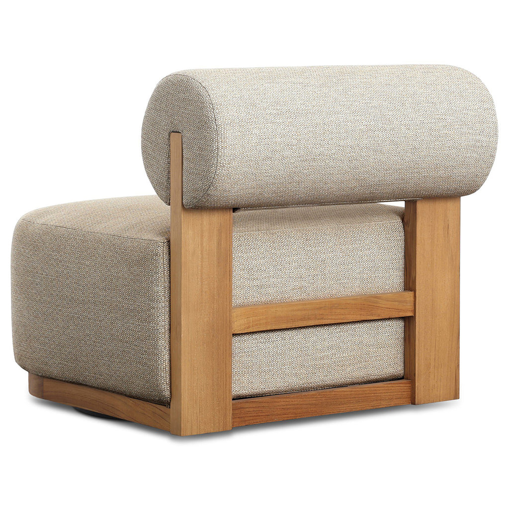 Rounded cushioning softens the linear, asymmetrical frame of this outdoor statement seating — all atop a 360-swivel. Solid FSC-certified teak frame. Cushioning is covered in 100% olefin, known for its UV-resistant, water-repellent and quick-drying abilities. Cover or store indoors during inclement weather and when not in use.