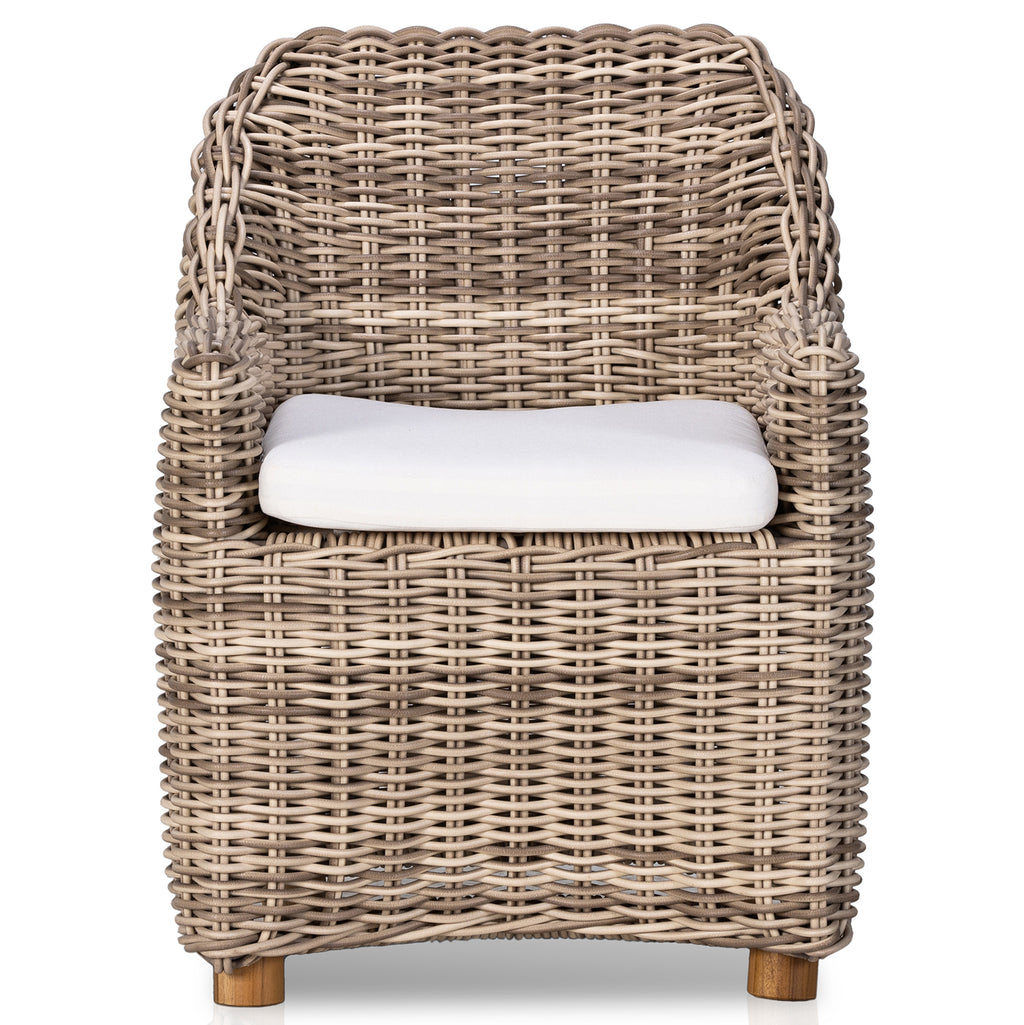 Traditional heritage shape on a grand scale. The outdoor dining chair is crafted from durable natural teak in a gorgeous, woven pattern highlighting the texture's natural highs and lows. Oversized with deep-seated comfort for the ultimate outdoor dining space. Cover or store indoors during inclement weather and when not in use.