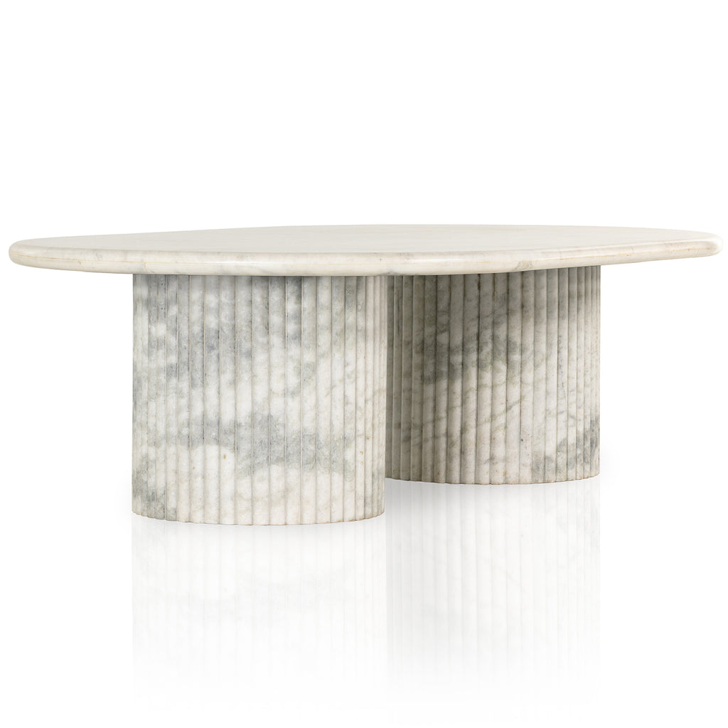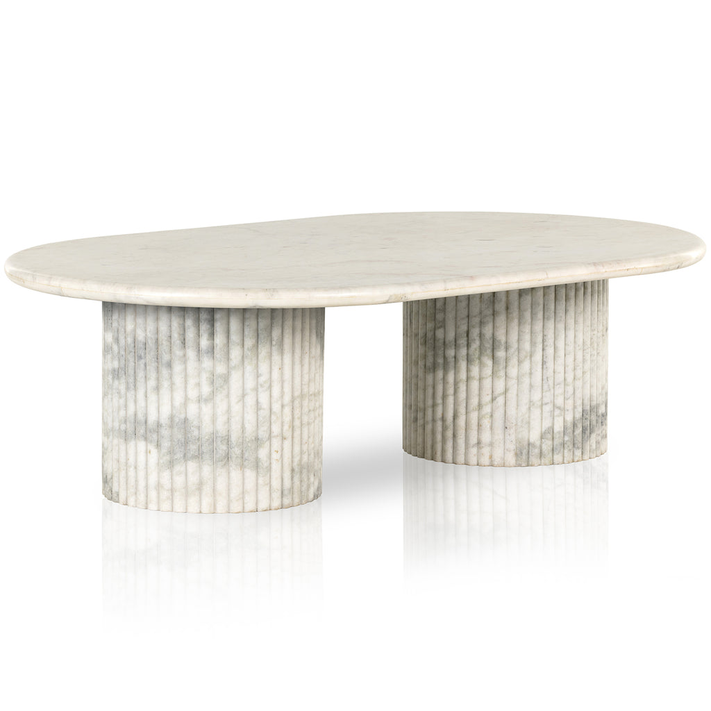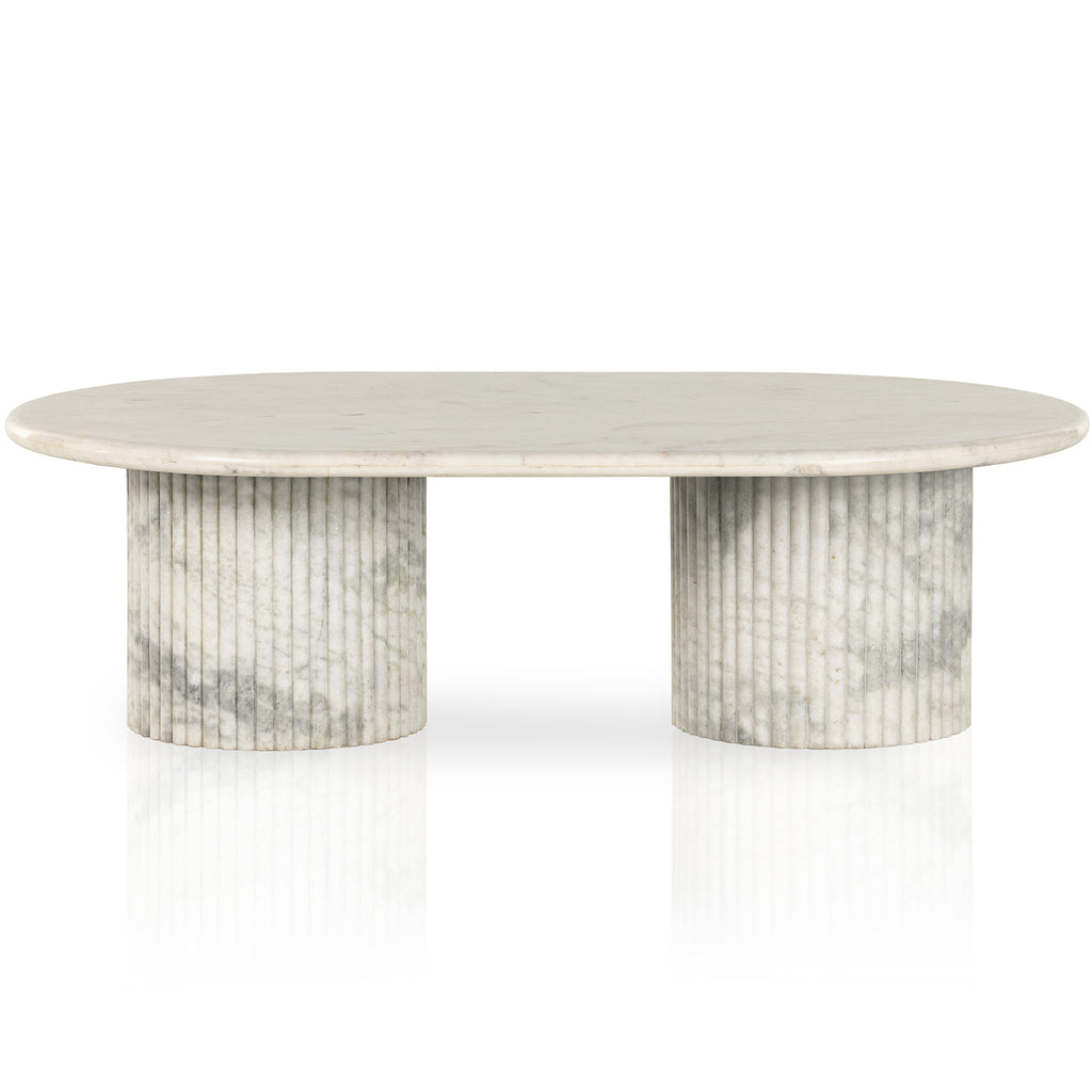 Italian-inspired for effortless sophistication. A swirling marble base is scalloped for a linear look with heavy texture, while an oval tabletop of polished white marble brings a shapely look to the living room.