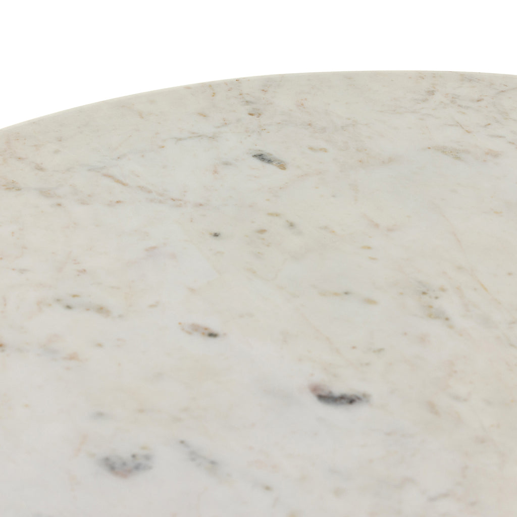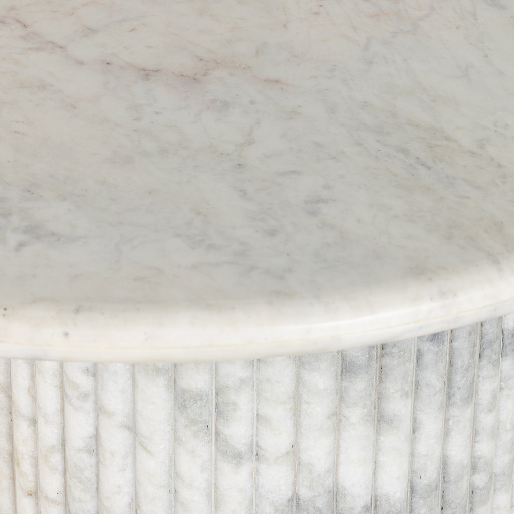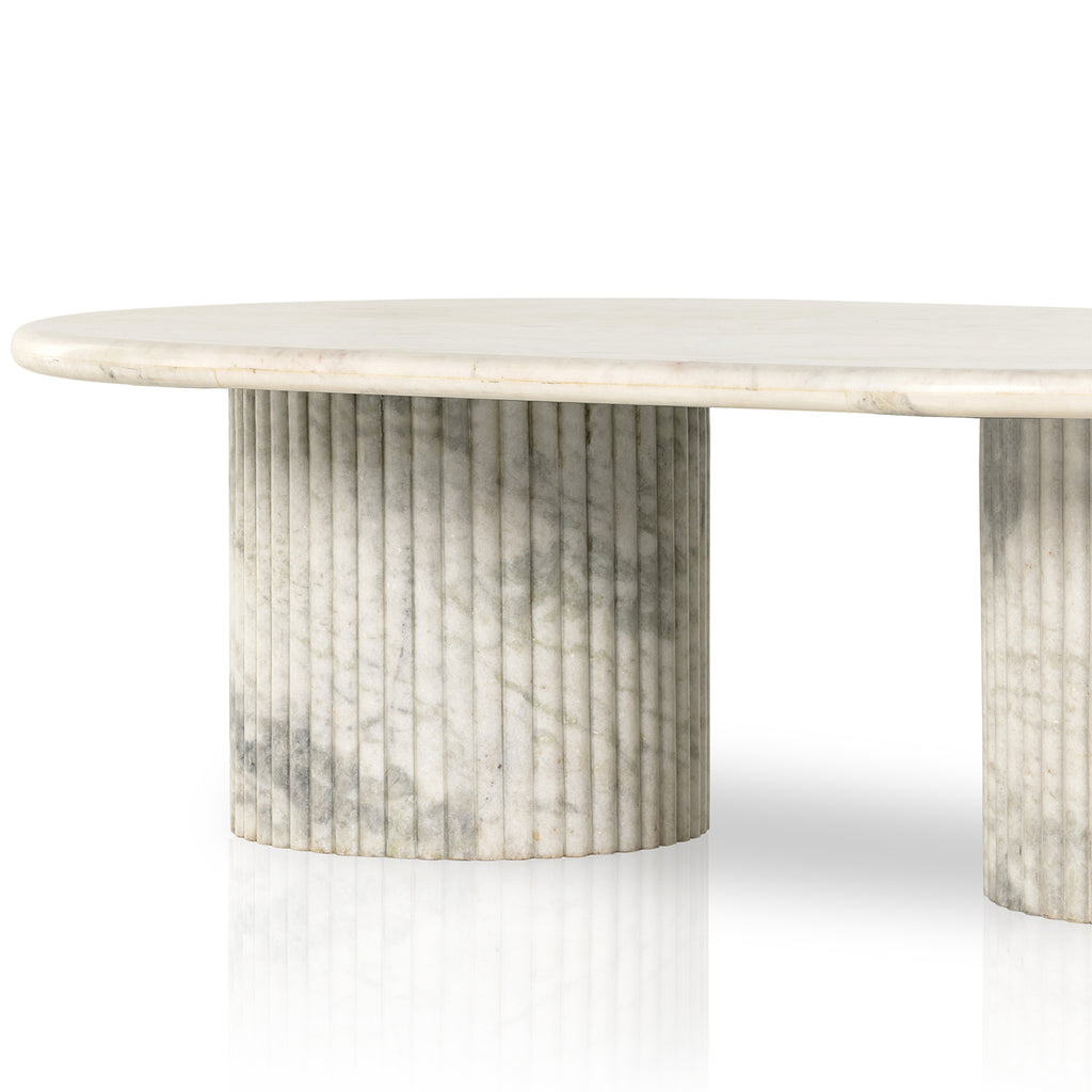 Italian-inspired for effortless sophistication. A swirling marble base is scalloped for a linear look with heavy texture, while an oval tabletop of polished white marble brings a shapely look to the living room.