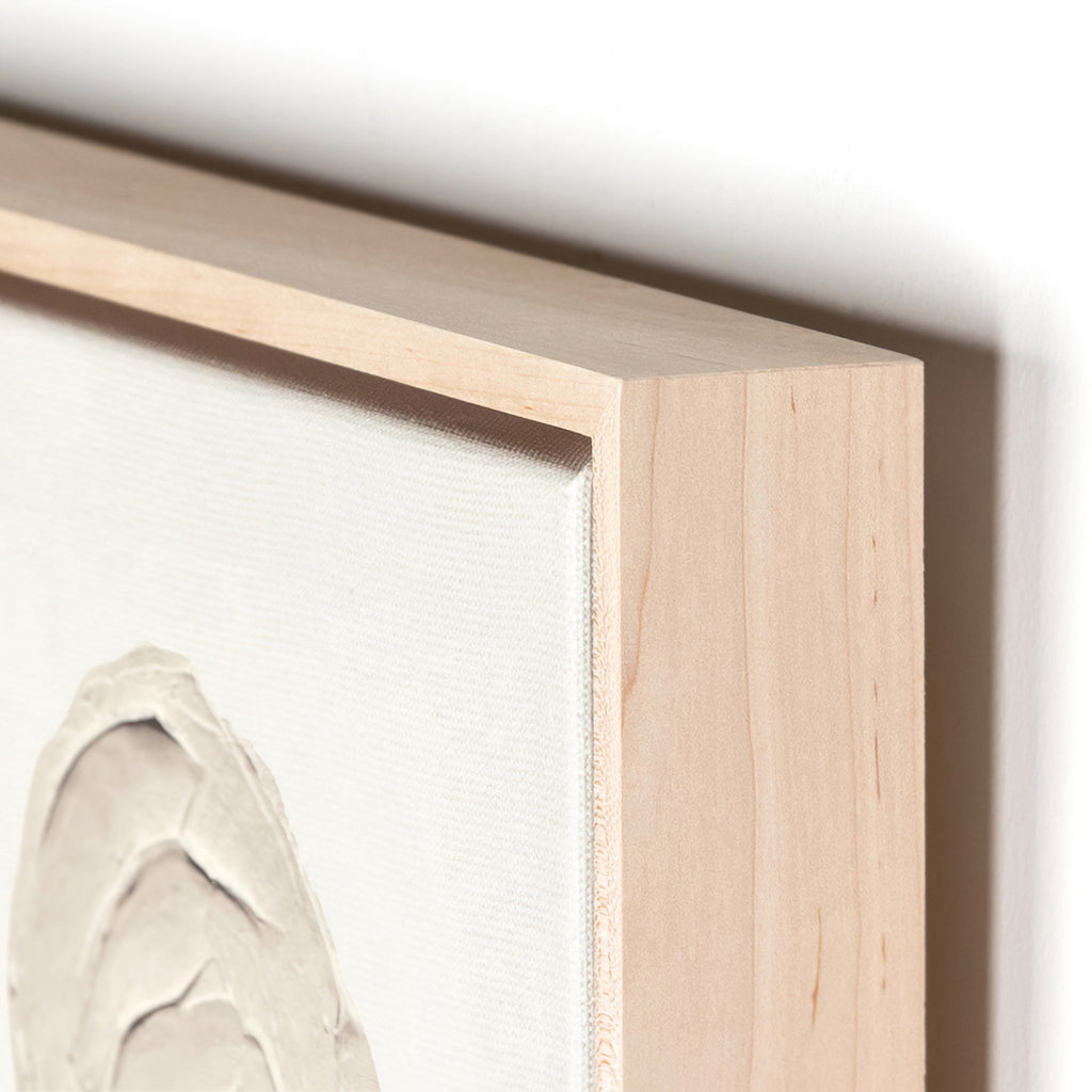 Inspired by their exploration into dimensional abstracted works, Coup d'Esprit's Portrait Series is produced in full texture with a spot varnish to further bring these pieces to life. Matte canvas floater within natural maple for a gallery-quality look. If not currently in stock, this texture-enhanced piece ships within three weeks. Handmade in Austin, Texas.