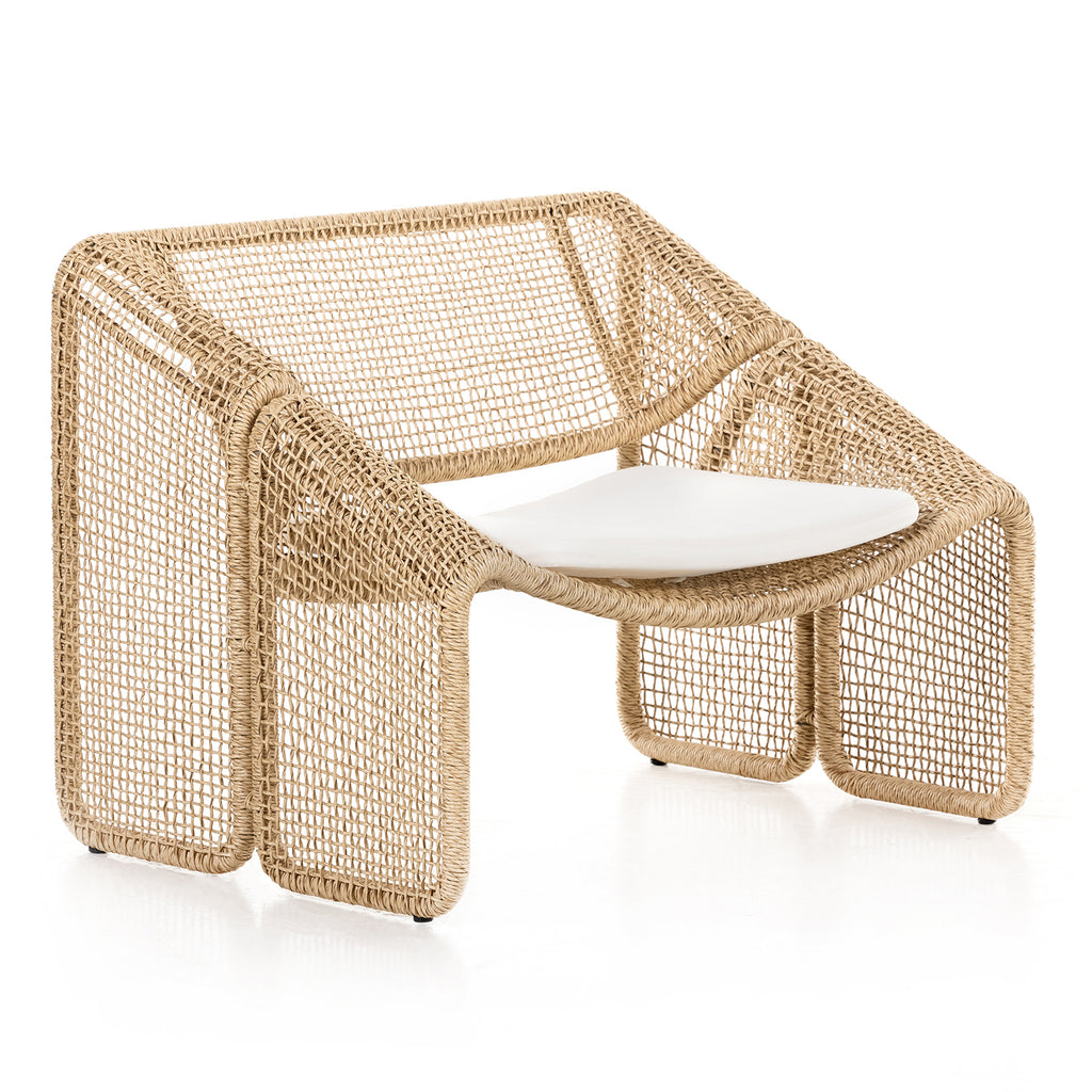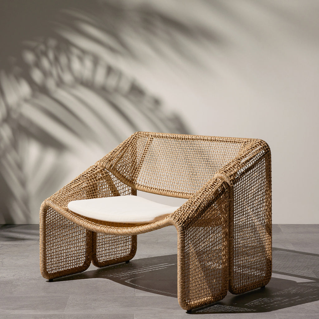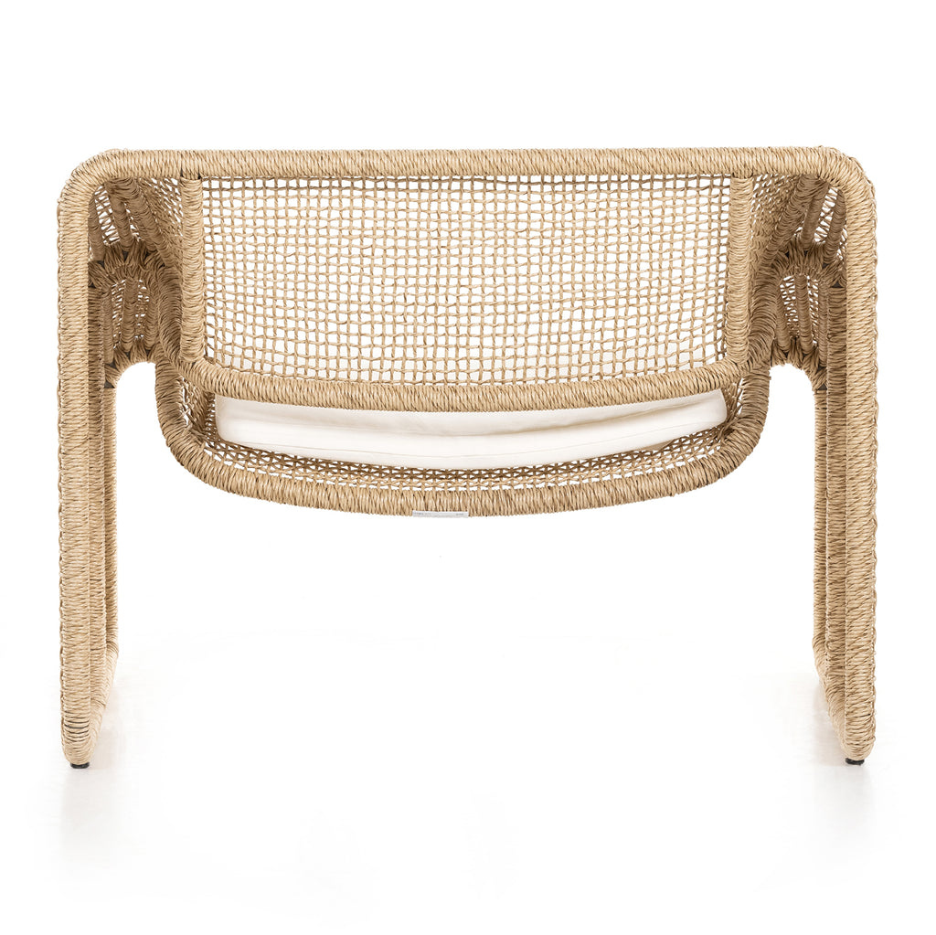 Great texture for the great outdoors. Woven all-weather wicker forms a light, hyacinth-like frame for a durable ivory seat cushion, spurring a grand, shapely look and feel. Cover or store indoors during inclement weather and when not in use.