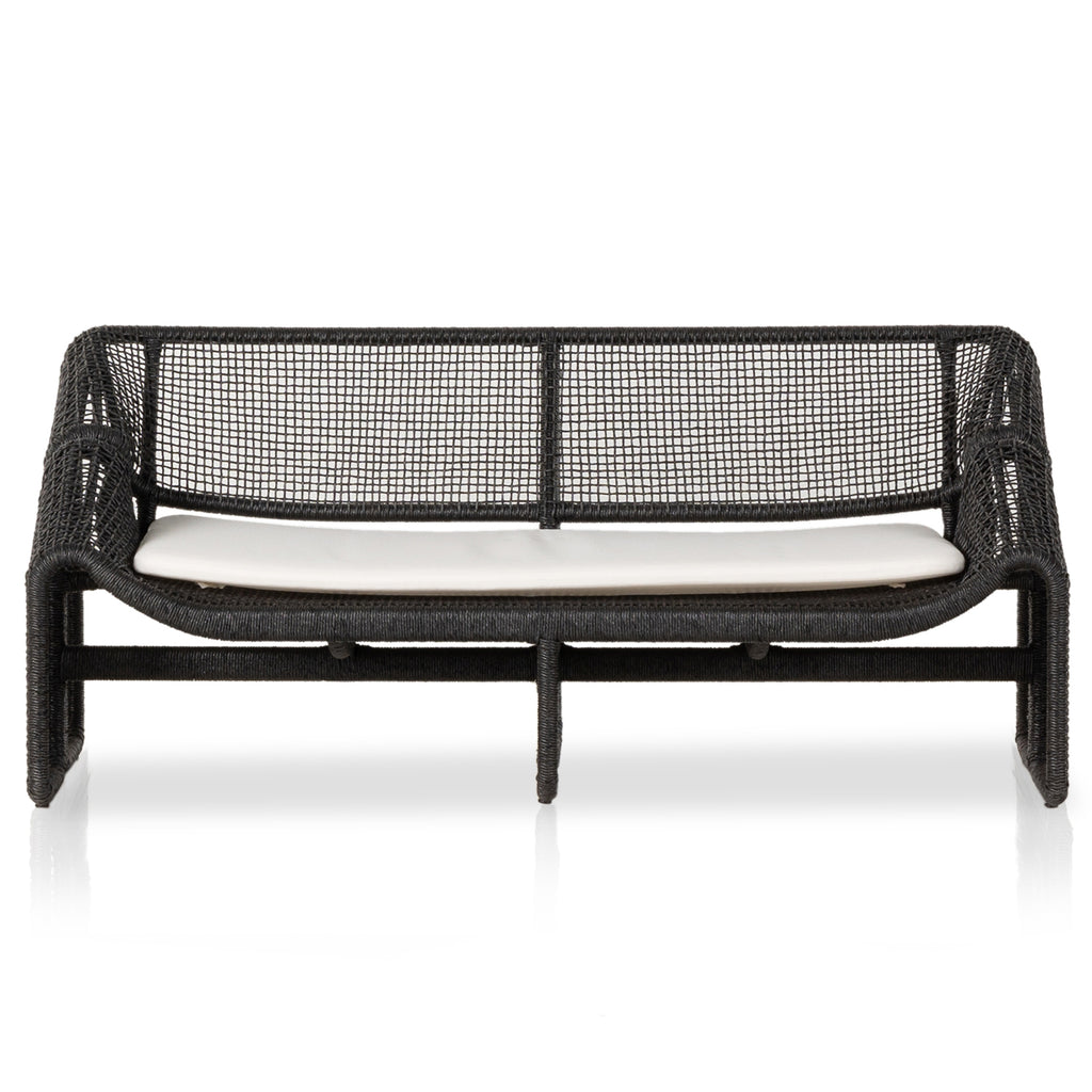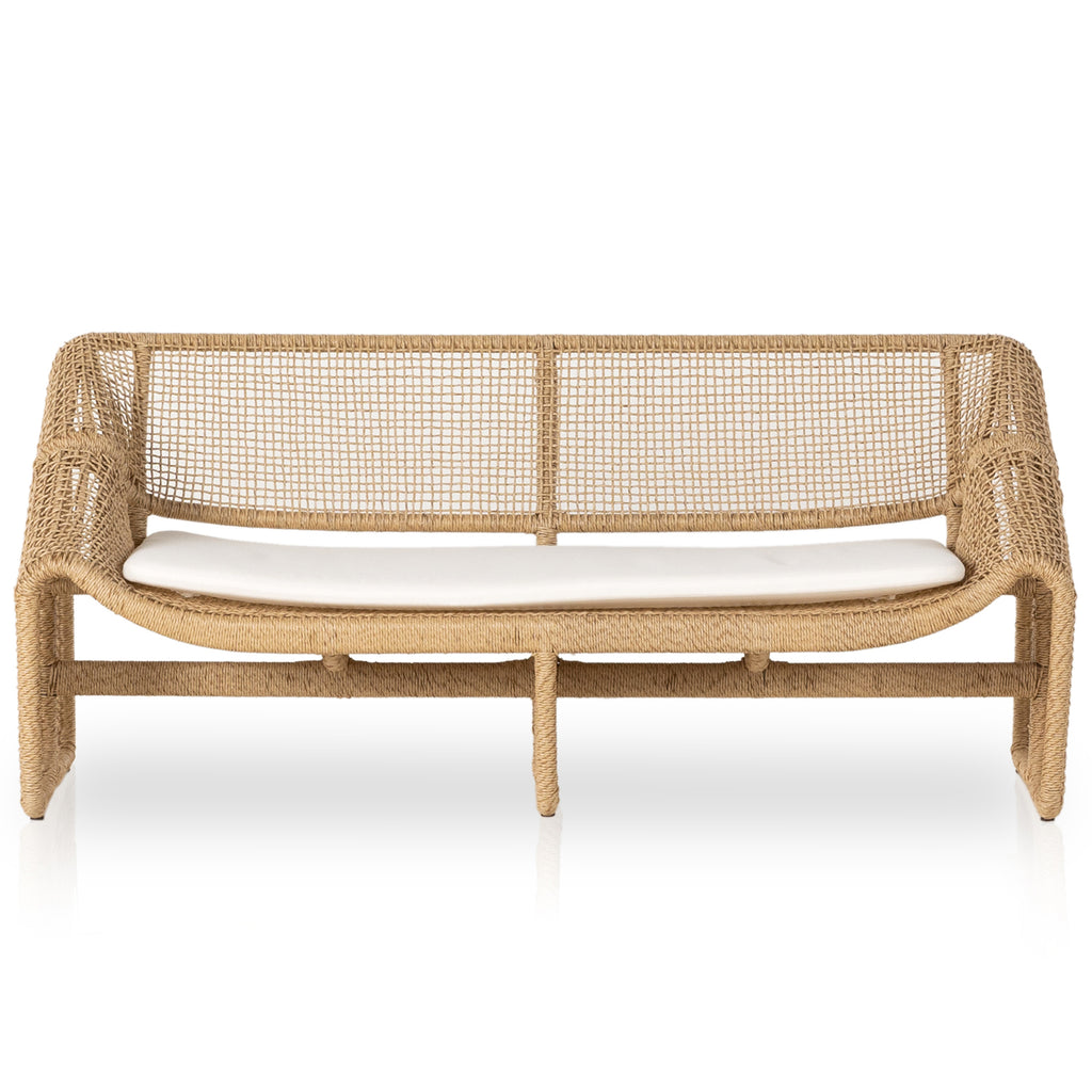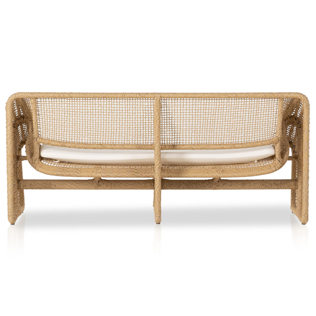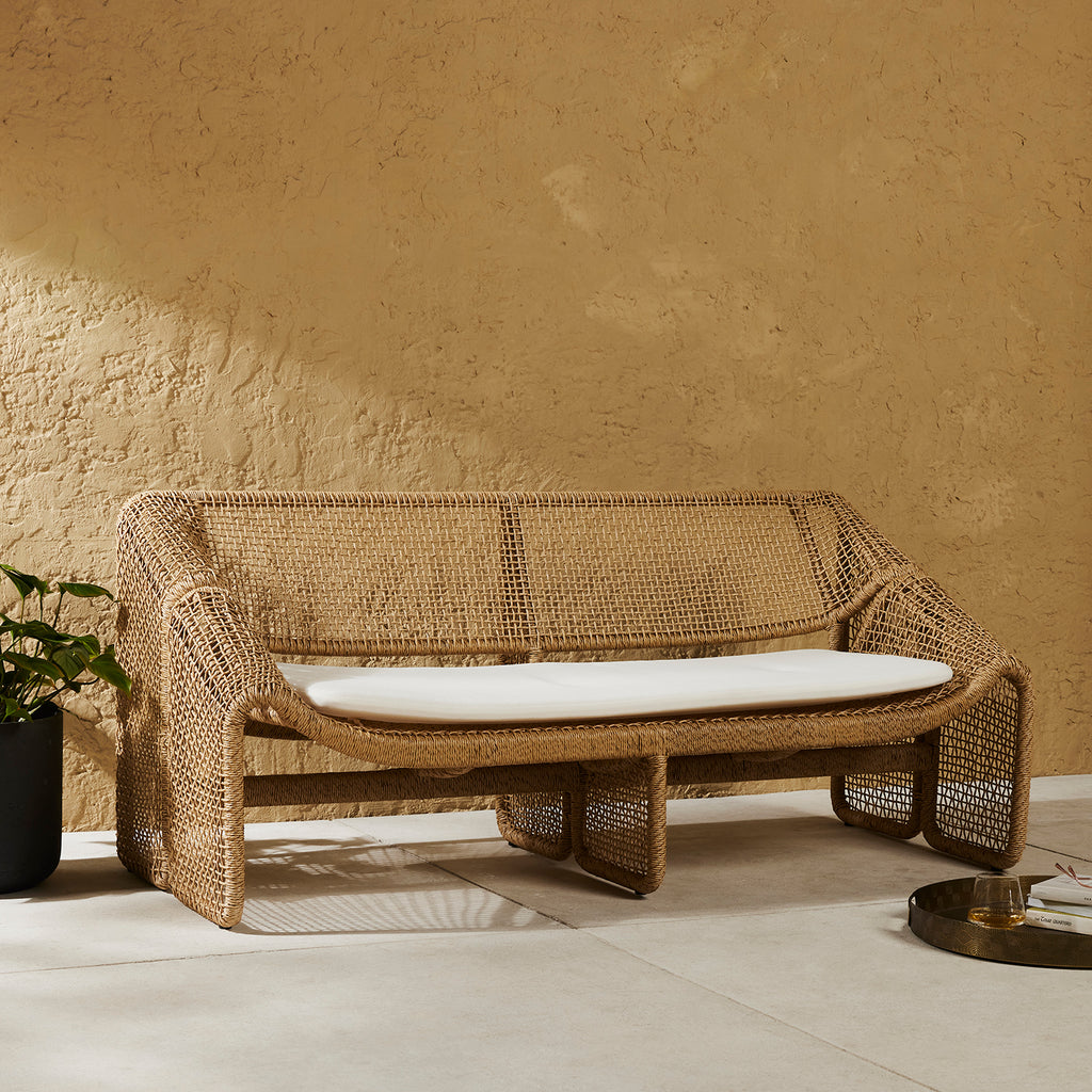 Great texture for the great outdoors in a sofa silhouette. Woven all-weather wicker forms a light, hyacinth-like frame for a durable seat cushion, spurring a grand, shapely look and feel. Cover or store indoors during inclement weather and when not in use
