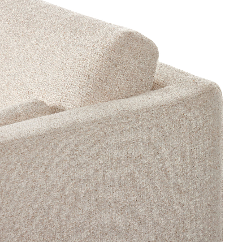An elevated take on the modular sectional. This new collection features clean lines with loose back and arm cushions. A smooth linear base is fully upholstered and wraps up the arms for a shelter effect. Covered in a new basketweave cream fabric that brings both texture and comfort to the entire piece.