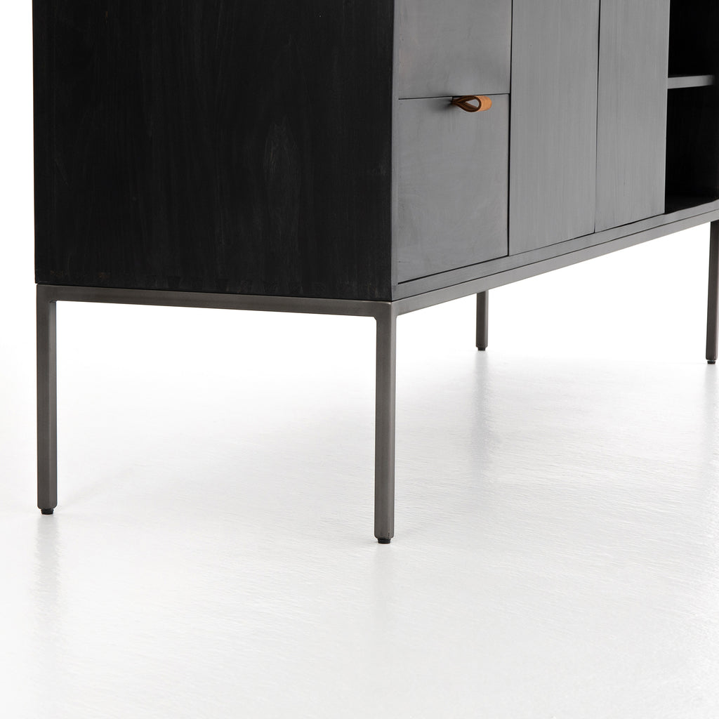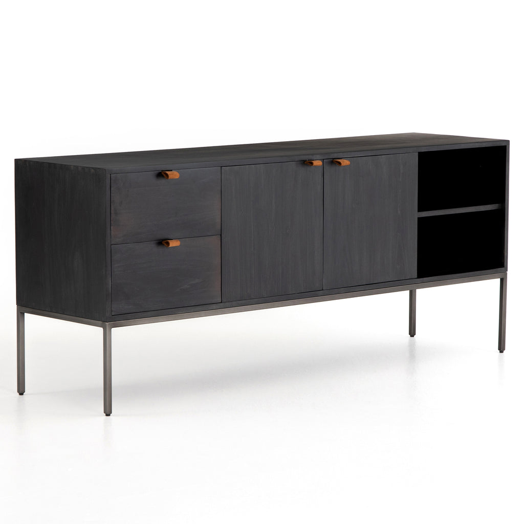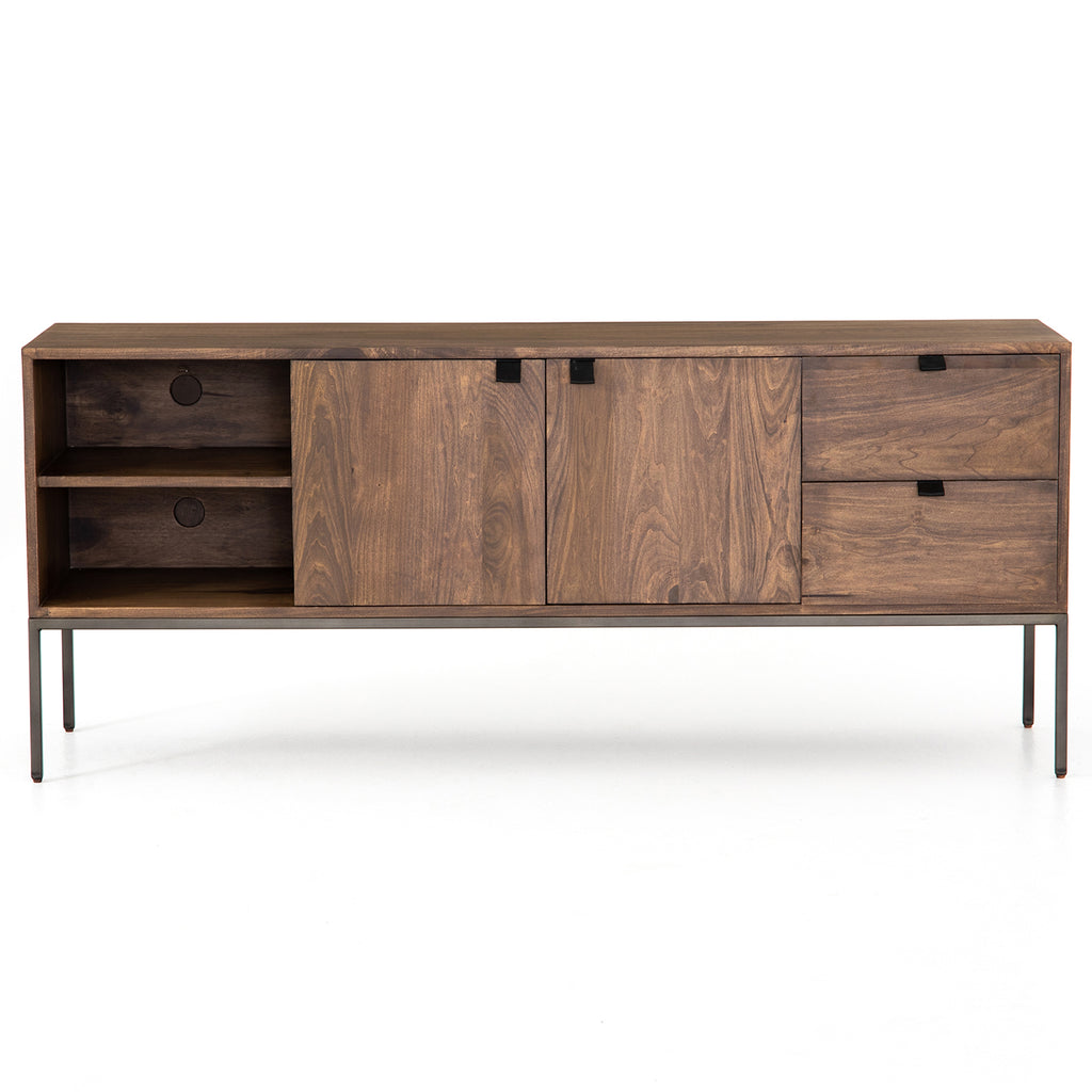 Inspired by clean mid-century design, poplar offers plenty of media storage space by way of open shelving, front-open doors and dual drawers. Metal-secured leather pulls add a textural element of surprise. Great solo or paired with matching bookcases.