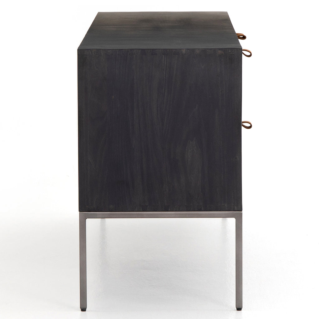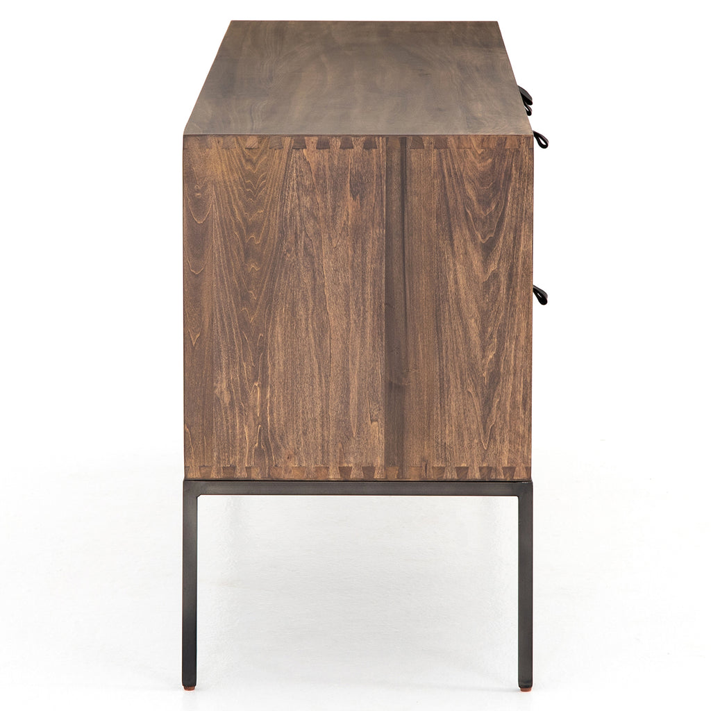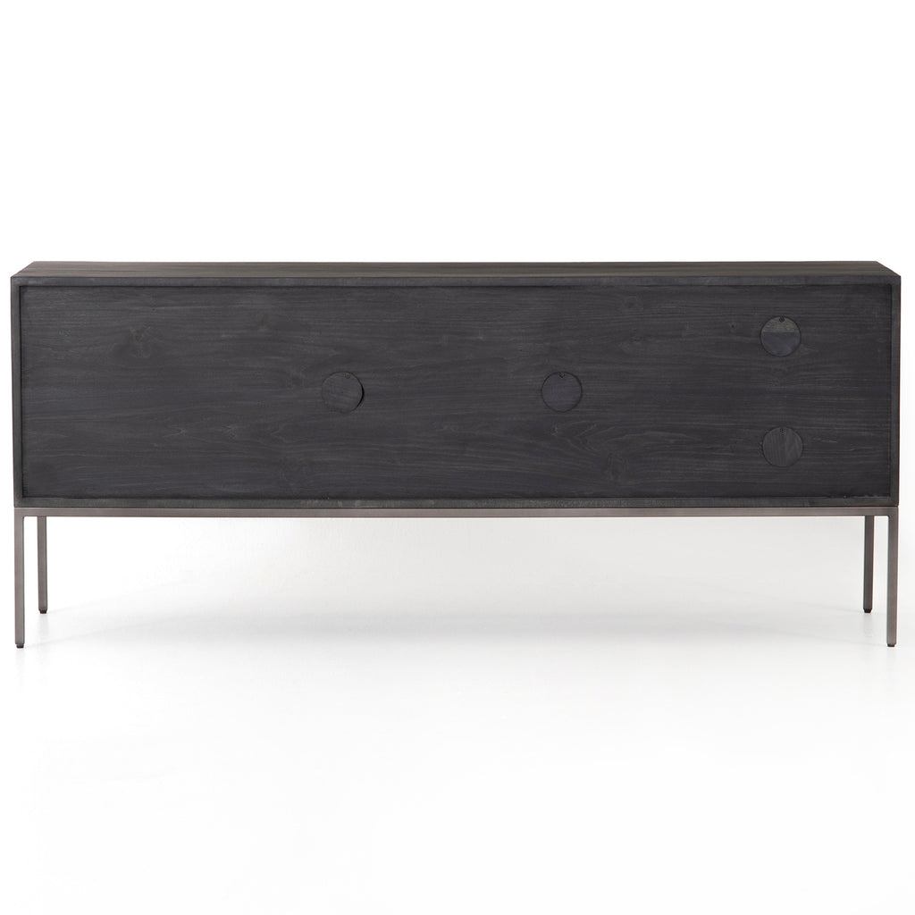 Inspired by clean mid-century design, poplar offers plenty of media storage space by way of open shelving, front-open doors and dual drawers. Metal-secured leather pulls add a textural element of surprise. Great solo or paired with matching bookcases.