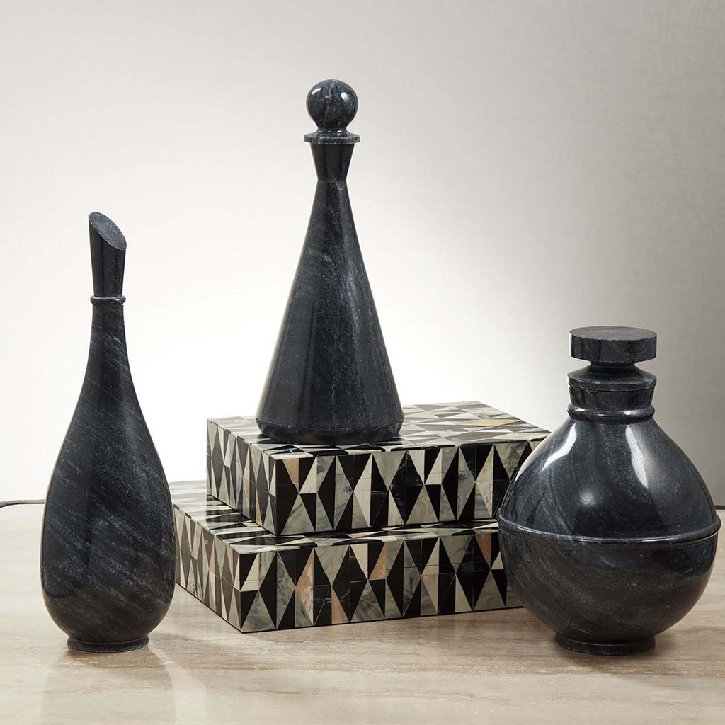 A black, white, and gray resin exterior in a geometric pattern features a singular brass diamond accent. The substrate of MDF give these items strength and stability to hold up over time without warping or movement. Available in two sizes.