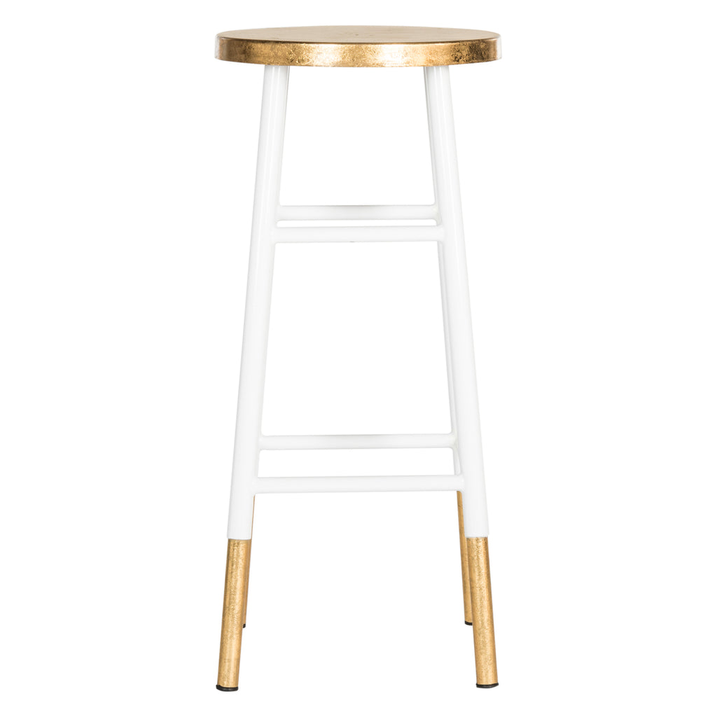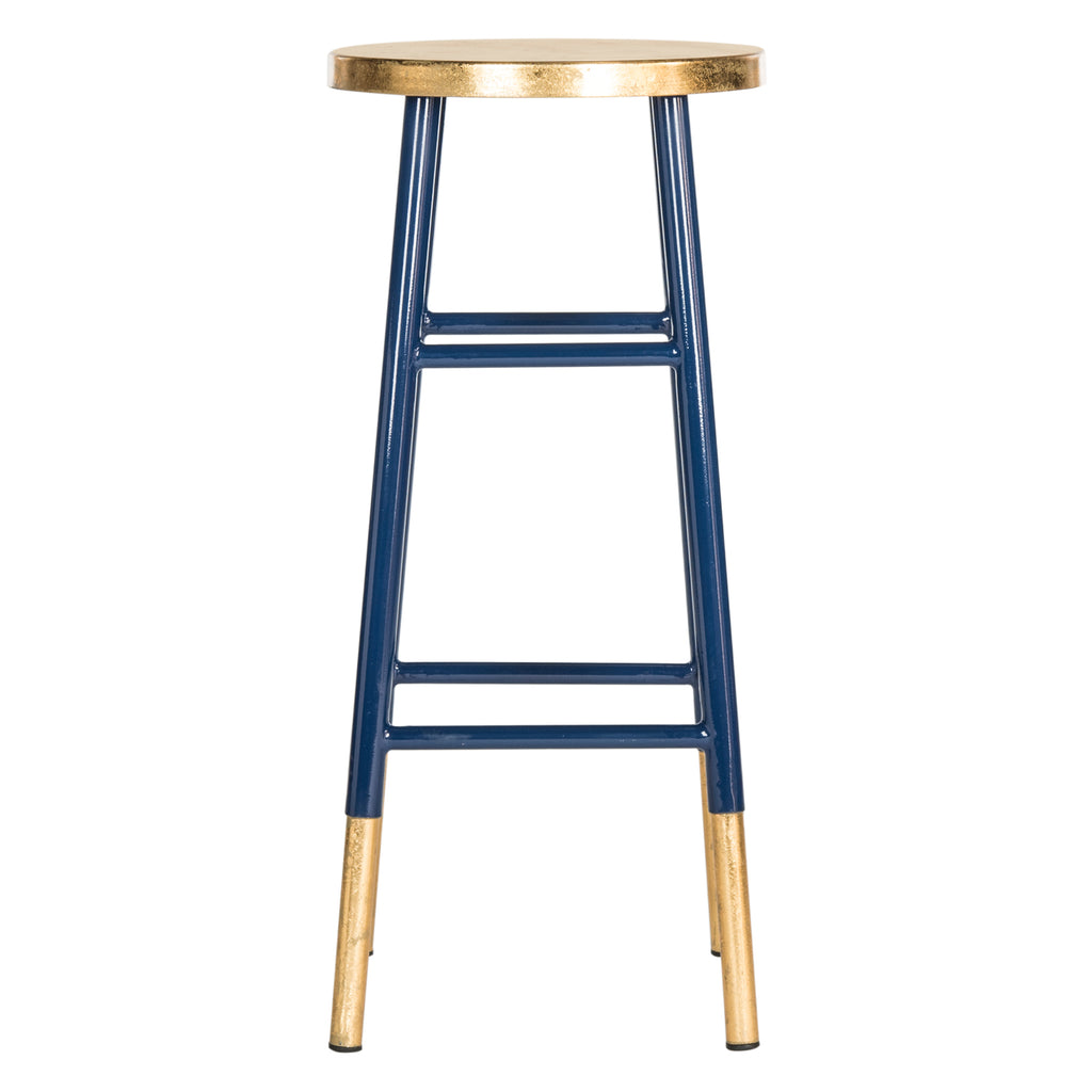 A colorful addition to a kitchen island or family room bar, this timeless bar stool is spruced up with a combination of lacquer and gold trim on leg caps and seat. This sturdy classic is crafted of iron with foot rest and cross bars for support.