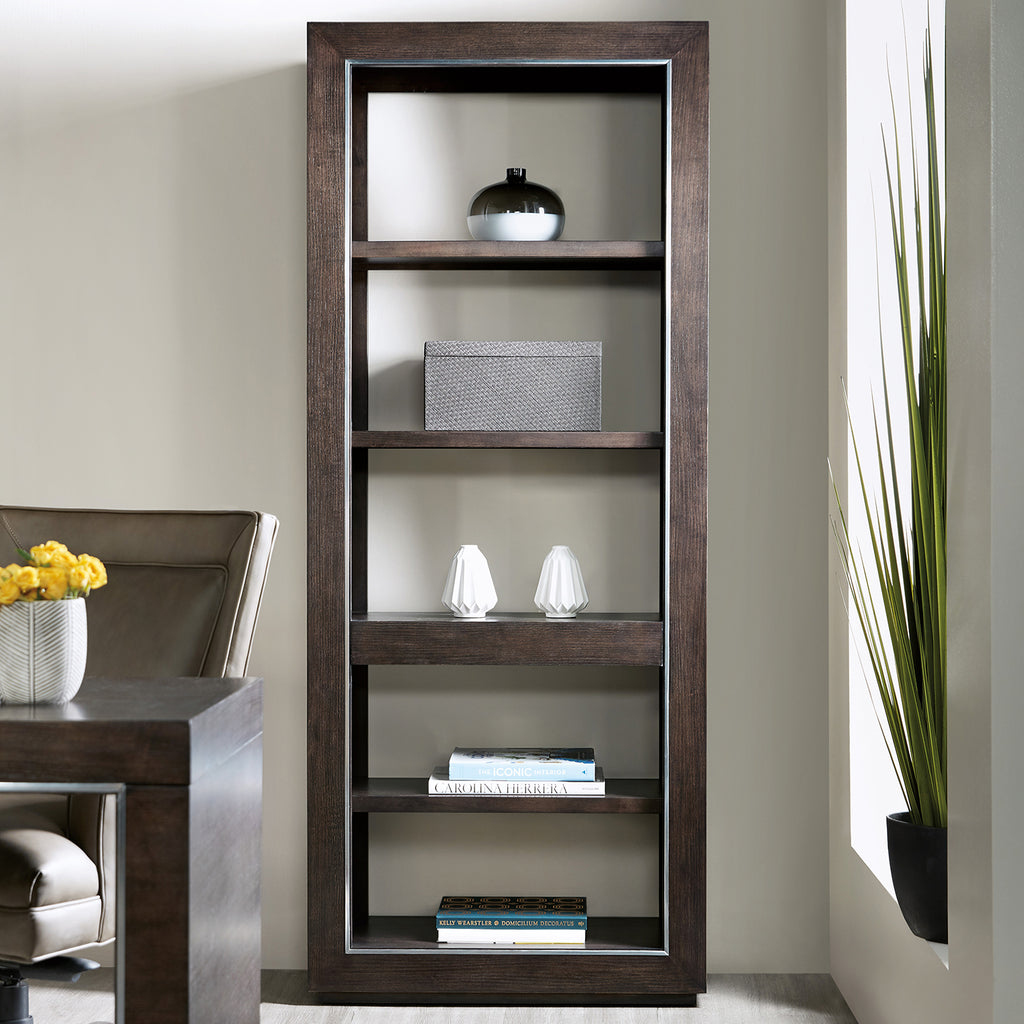 Add stylish storage to any space with the House Blend Etagere with the sleek combination of a Dark Roast finish over Quartered Ash Veneers and silver metal trim. Measuring 30 ¾ inches wide by 14 inches deep, the etagere is versatile for many spaces and features 3 adjustable wood shelves and one fixed shelf.