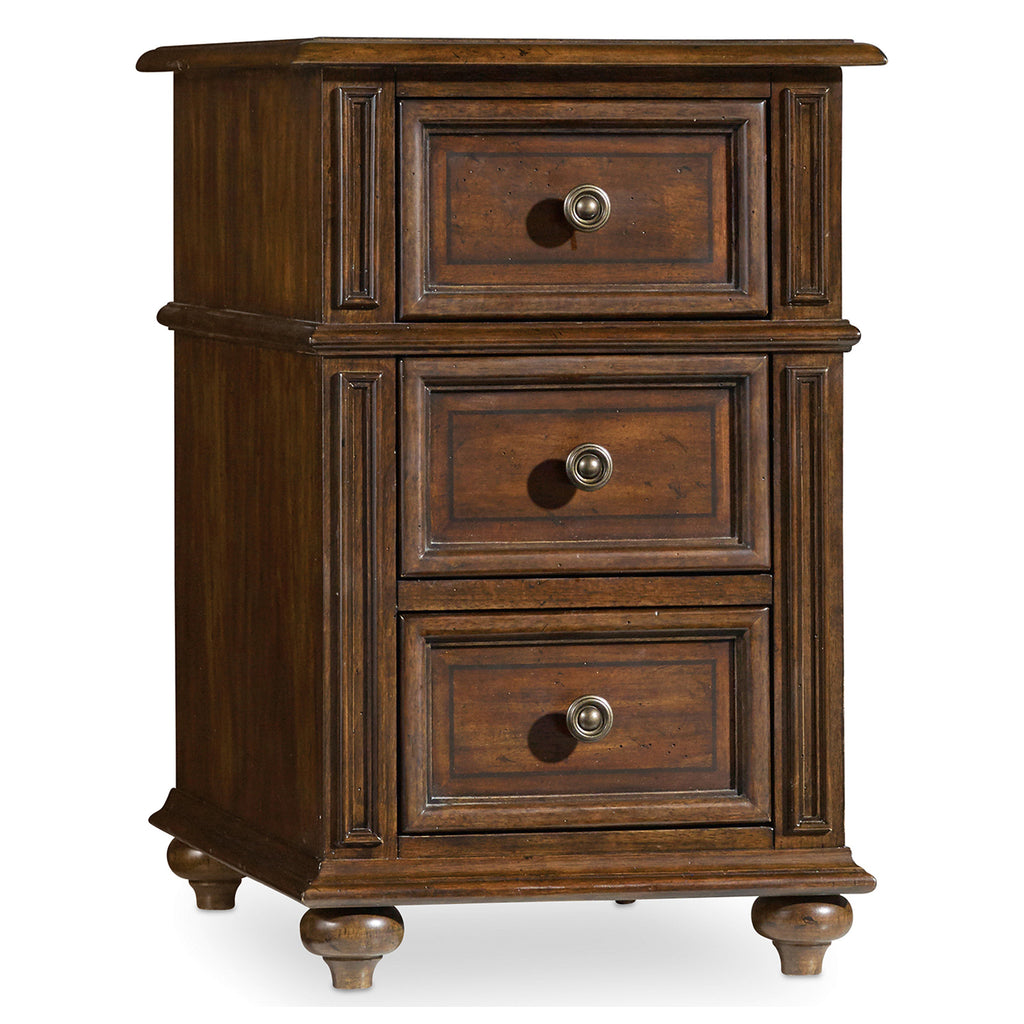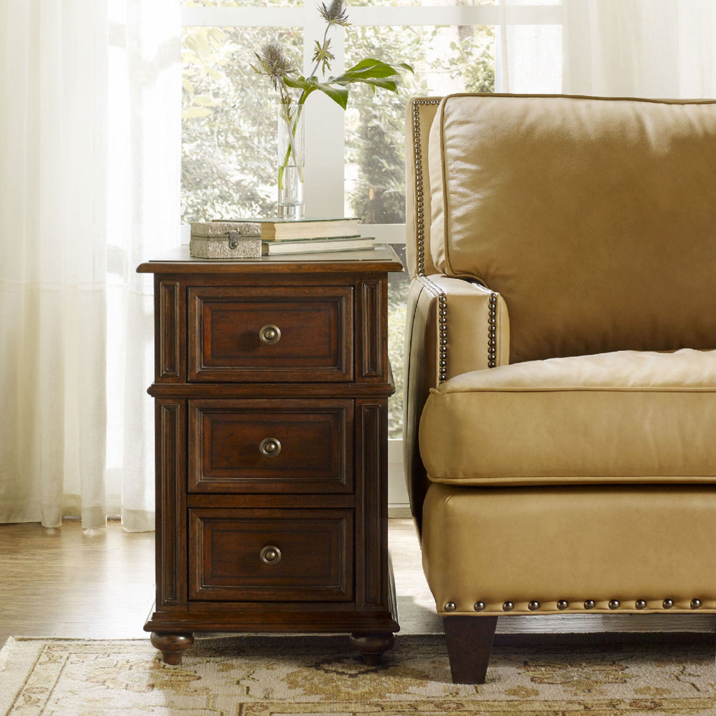 Chic and classic, the three-drawer Leesburg Chairside Chest brings comfort and convenience to your living space. A compact style icon at only 15 inches wide, this piece packs a punch even for tight spaces. Crafted of Swirl Mahogany and Ebony Veneers, the chest is finished with elegant cathedral and swirl mahogany veneers with light distressing for an authentic feel. The custom-designed knobs have an antique brass color.