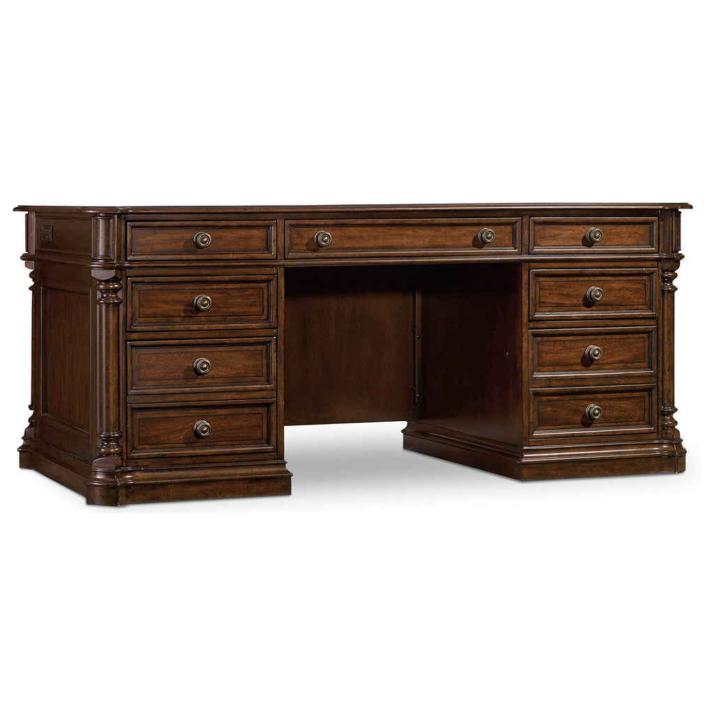 Create an inspiring workspace with the stunning Leesburg Executive Desk with a fashionable flair and classic design details like column motifs and decorative Swirl Mahogany and Ebony Veneers. The light distressing takes traditional style to a more casual and inviting place. The center drawer has a drop-front for keyboard use, and there are 3 utility drawers, two box drawers with dividers and removable pencil tray and mouse pad, along with two locking file drawers with Pendaflex letter/legal filing system. One door with one adjustable shelf and one pullout printer tray.