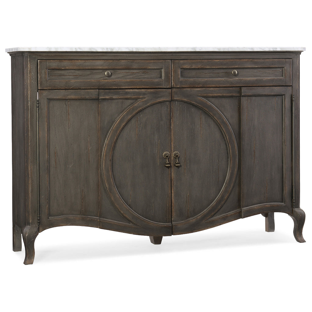 This chic and shapely credenza has a raised circle motif that dissects the center doors, classic cabriole legs and an elegant marble top. Almost too good to be true: this gorgeous piece is TV-ready with a ventilated back panel, two adjustable shelves and two drawers and will accommodate up to a 60-inch flat screen TV. Finish is a charcoal color.