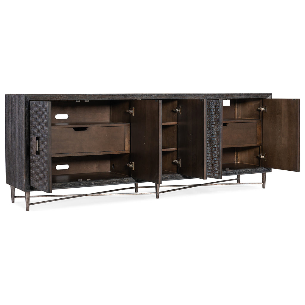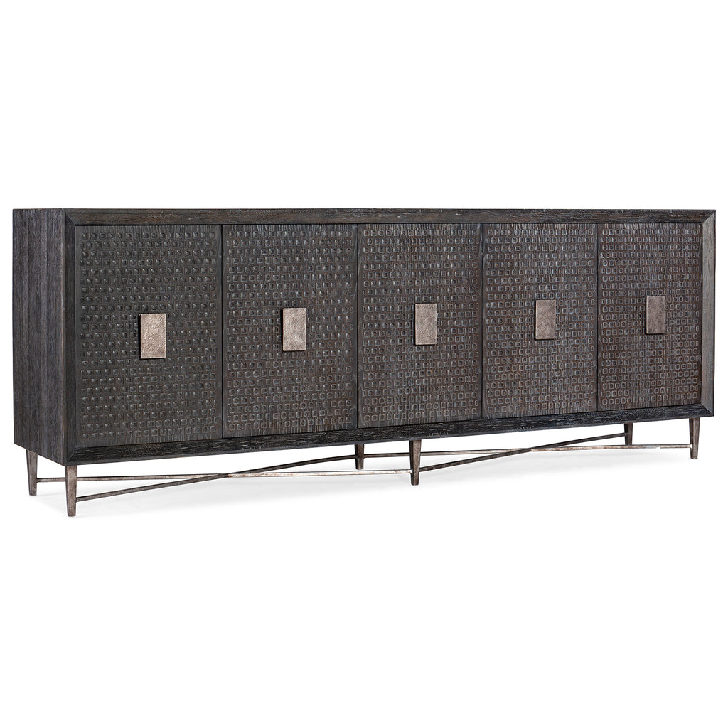 An unexpected eclectic blending of texture, form and function with an understated and timeless beauty, the Mélange Keenan Five-Door Credenza combines a weave-like tactile surface with a shaped silver metal base and distressed metal hardware in an oversized rectangle shape. There’s one drawer behind the pair of left doors, creating one shelf, and one drawer behind the pair of right doors, creating one shelf, and two adjustable shelves behind the center door. Crafted of Oak Veneers, resin and metal, there’s a ventilated back panel and wire management holes in the back panel.