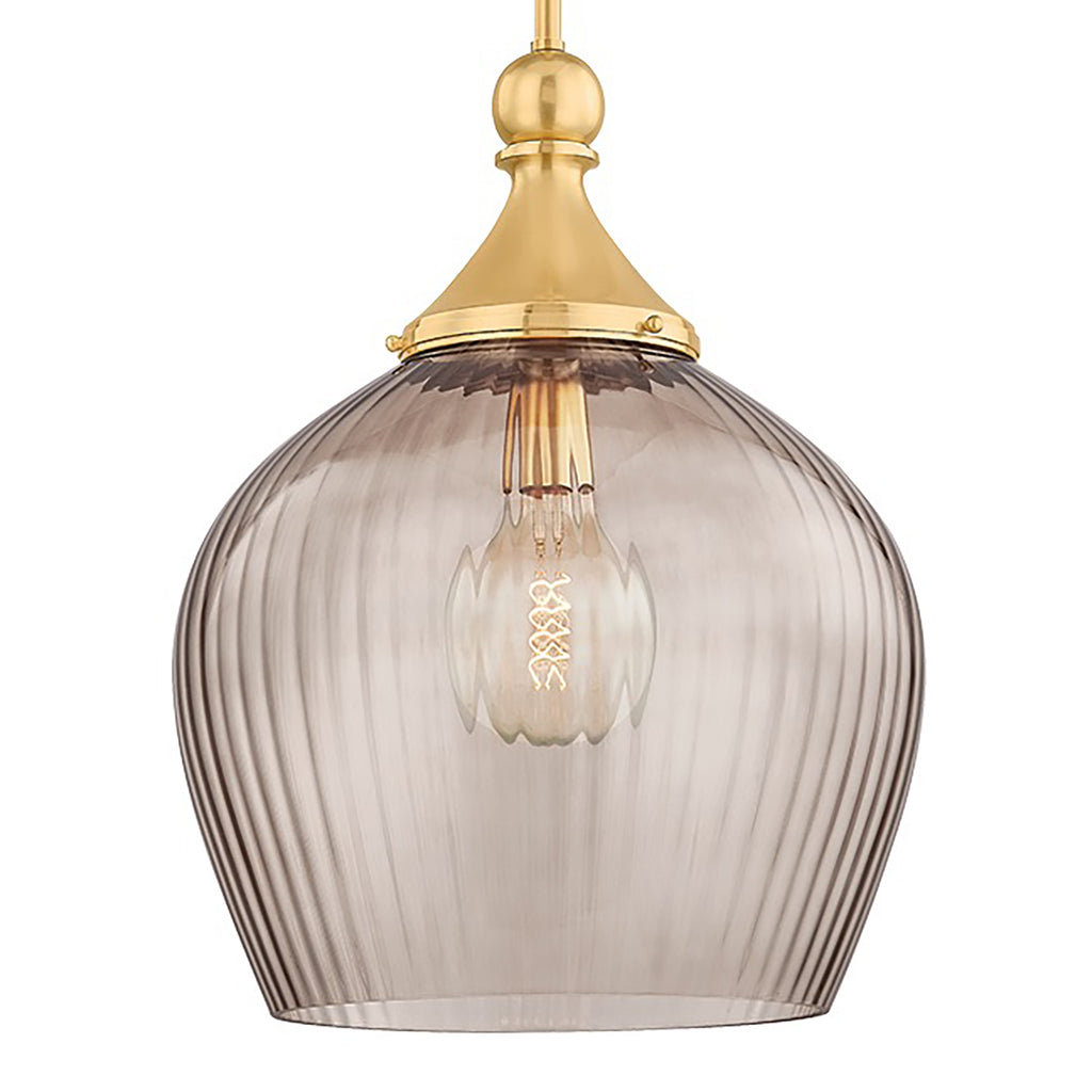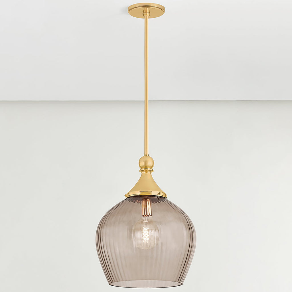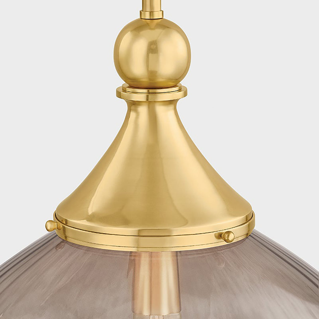 The elegance of vintage Art Deco style blooms to life in the glamorous Hudson Valley Lighting Chatton family. Blown from light bronze fluted glass, the tulip-shaped shade provides a delicate companion to the graceful metalwork finished in Aged Brass. Considered details like the graceful gooseneck arm on the sconce, and a large bead-like sphere accent further the botanical motif. Available as a sconce or pendant in two sizes, Chatton brings an area into focus with its whimsical ways.