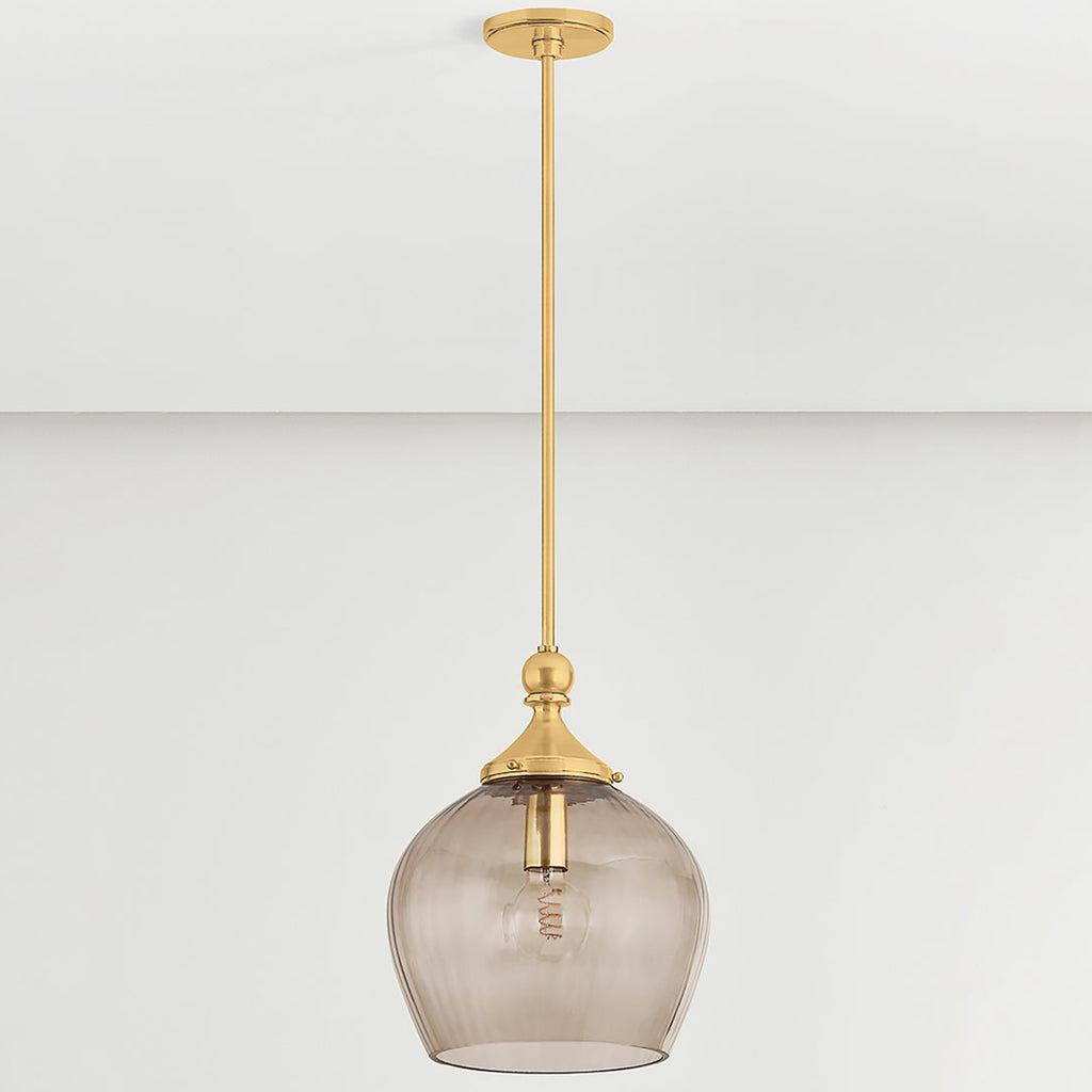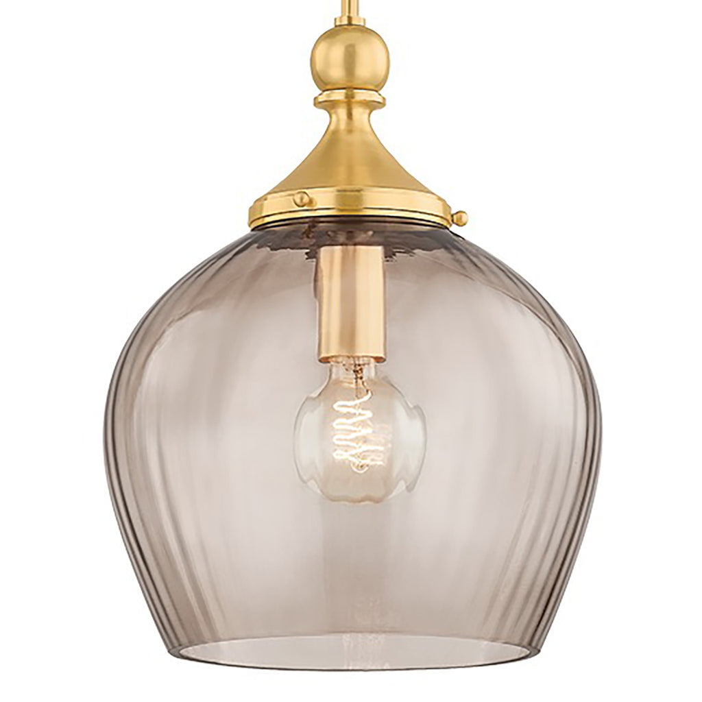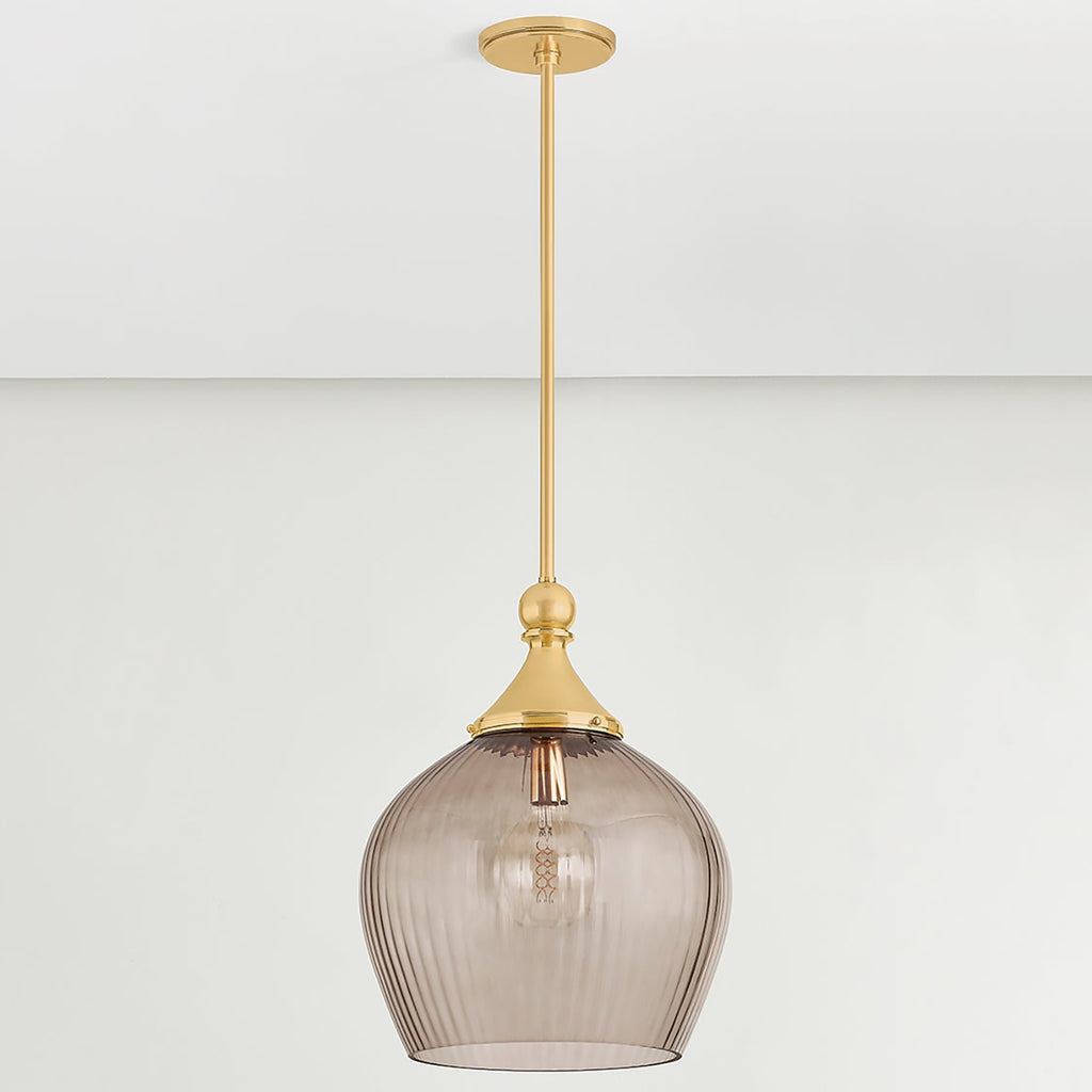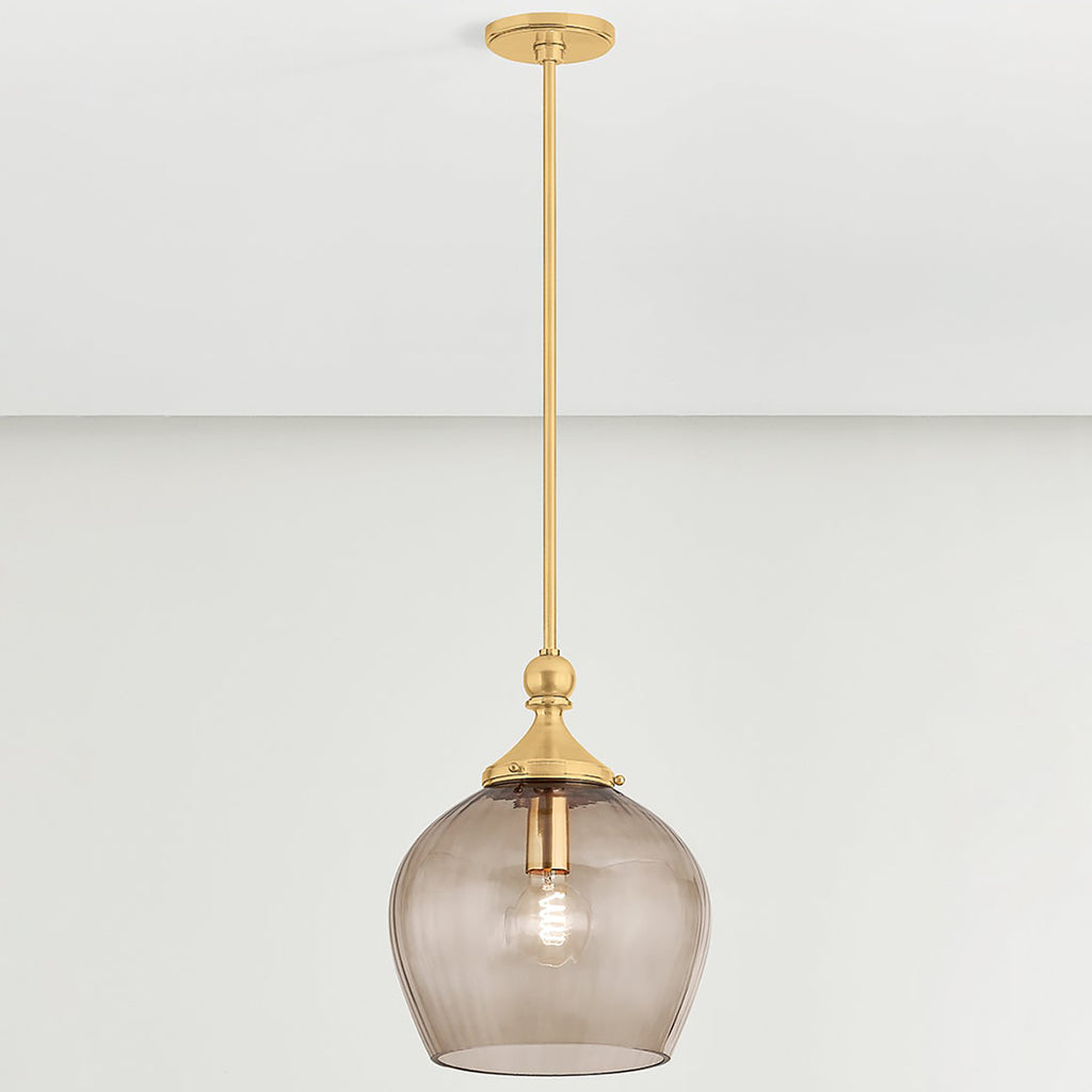 The elegance of vintage Art Deco style blooms to life in the glamorous Hudson Valley Lighting Chatton family. Blown from light bronze fluted glass, the tulip-shaped shade provides a delicate companion to the graceful metalwork finished in Aged Brass. Considered details like the graceful gooseneck arm on the sconce, and a large bead-like sphere accent further the botanical motif. Available as a sconce or pendant in two sizes, Chatton brings an area into focus with its whimsical ways.