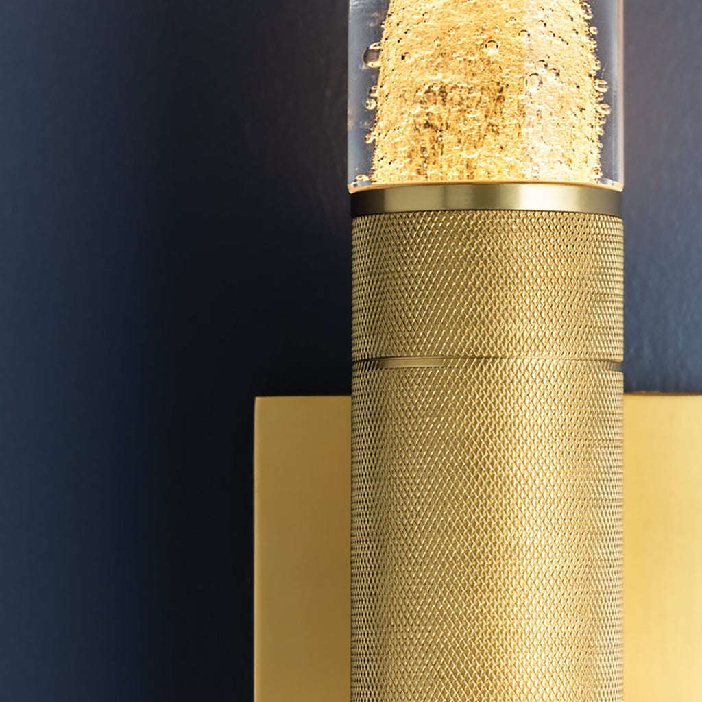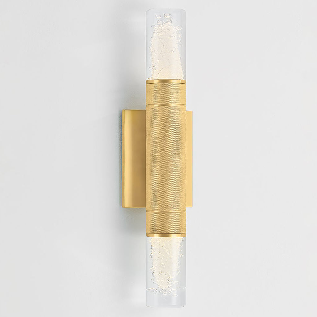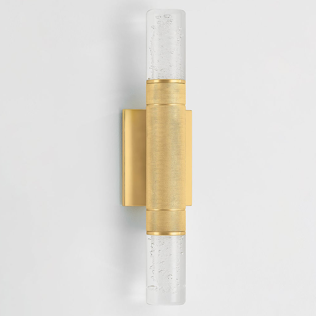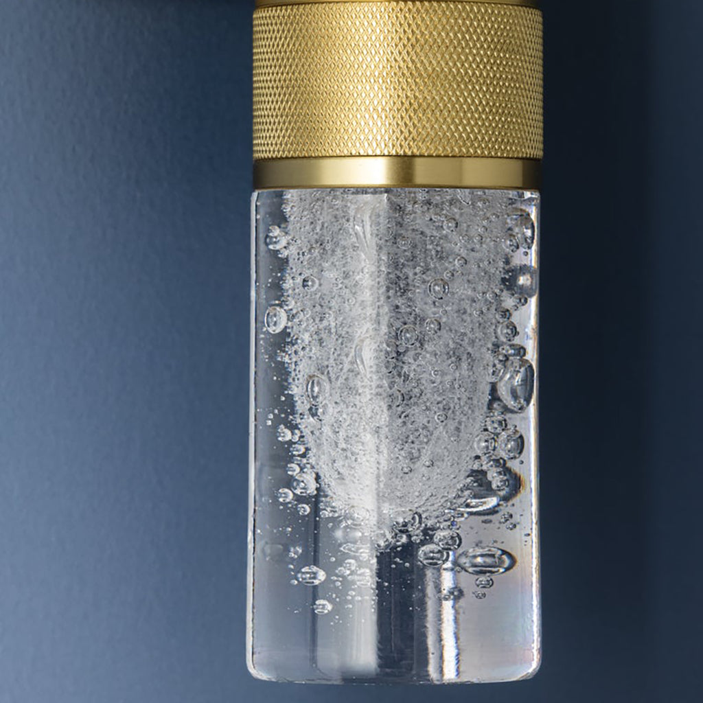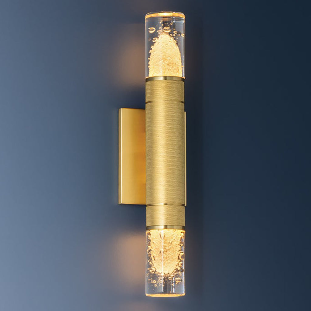 Hudson Valley Lighting Glen Cove is a petite wall sconce that combines a graphic silhouette with specialty glass. The central metal stem, finished in Aged Brass, features distinctive knurling for added texture. Clear-seeded glass shades are positioned at both ends of the stem, allowing light to radiate in every direction. Glen Cove serves as both a decorative and functional fixture, perfect for use alone or in multiples.