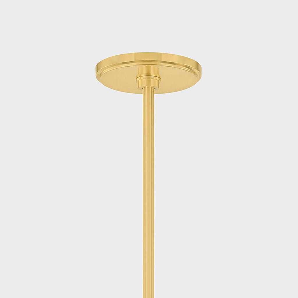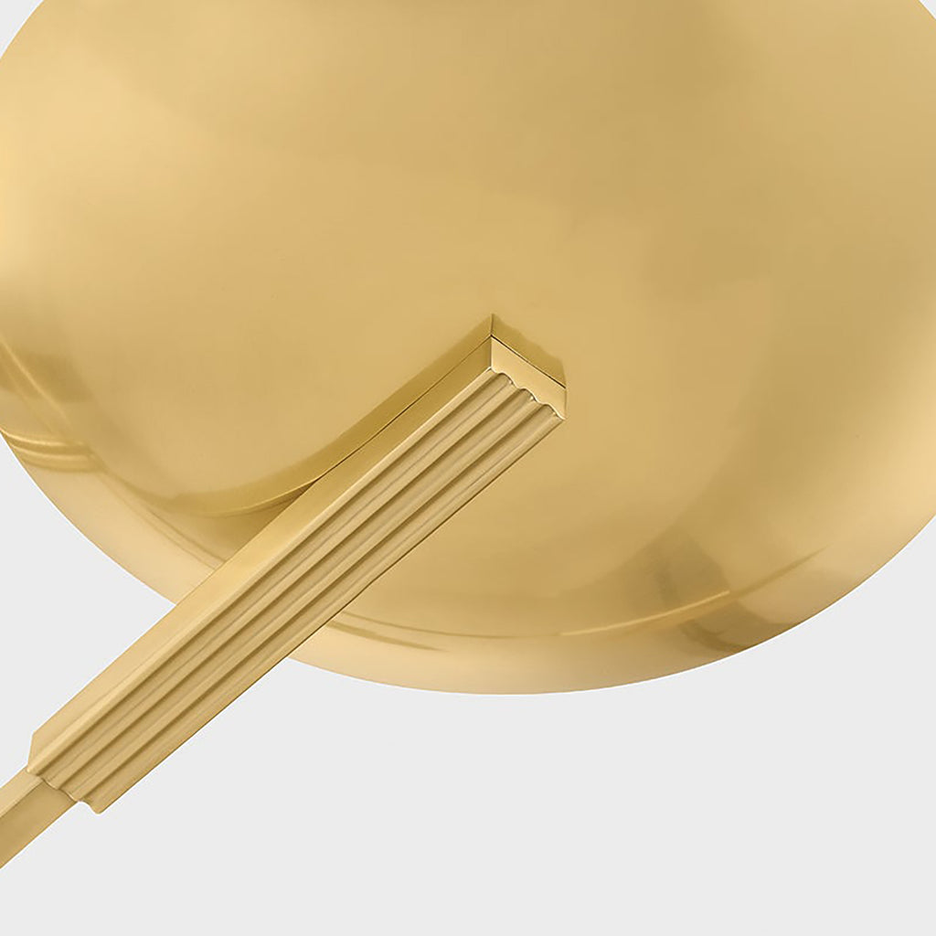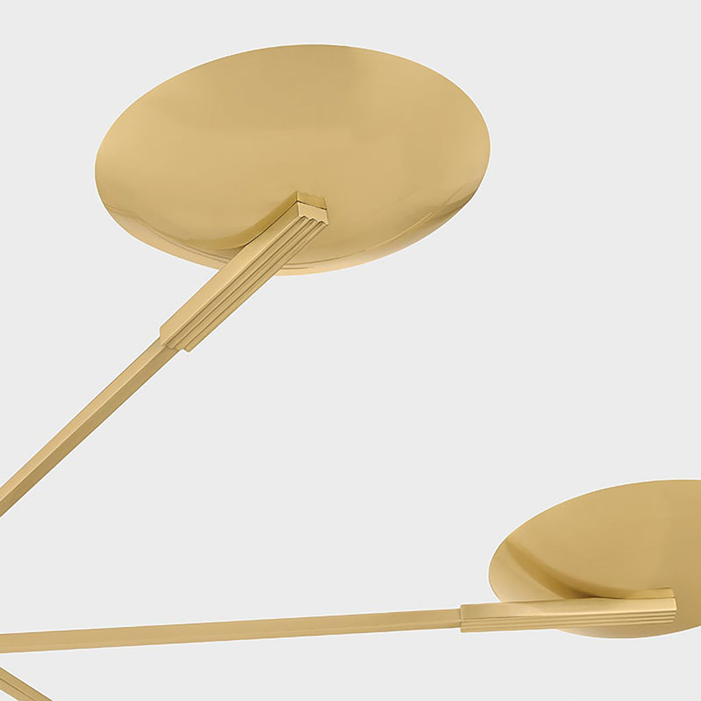 The Hudson Valley Lighting Johnson family gives a modernist silhouette an industrial twist. Reminiscent of spokes, the slender arms of this chandelier and flush mount support shallow dome shades that direct LED light upwards. Each arm features a subtle linear knurl at the ends, while the center stem is grooved at the bottom for added texture. Finished in Aged Brass.