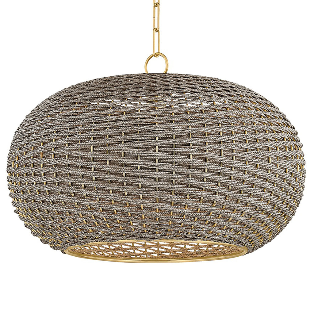 The Hudson Valley Lighting Penarth family takes a tailored approach to bringing nature indoors. Woven in a unique diagonal pattern, the seagrass string shade creates a dynamic spiraling effect that allows light to seep through. The bottom rim of the fixture is finished in Aged Brass, coordinating with the pendant’s chain. Also available as a flush mount, Penarth provides a warm, inviting aesthetic with its sophisticated shaping and natural materiality.