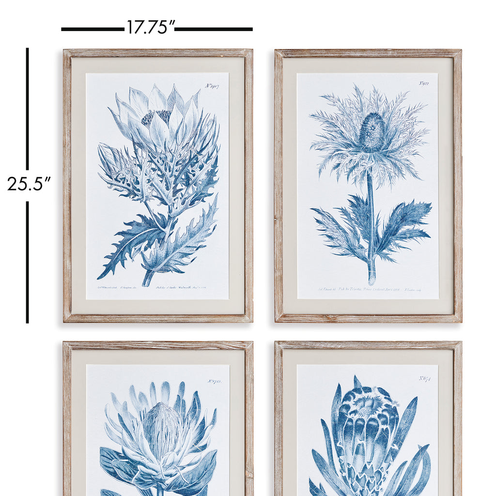 Monochromatic in a soft indigo hue, this set of protea illustrations in vintage botanical style make a gorgeous traditional set. Finished off with a taupe mat and whitewashed natural wood frame, they are perfect for powder room, kitchen or study.
