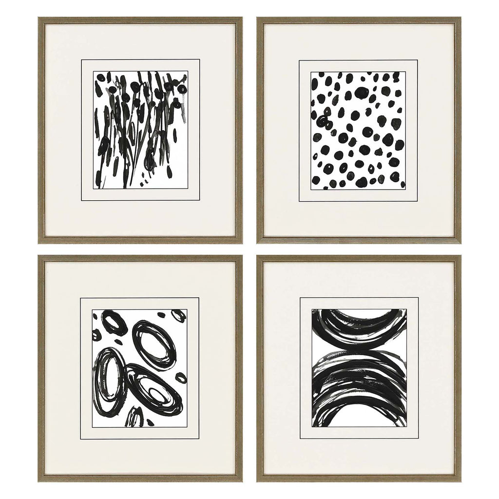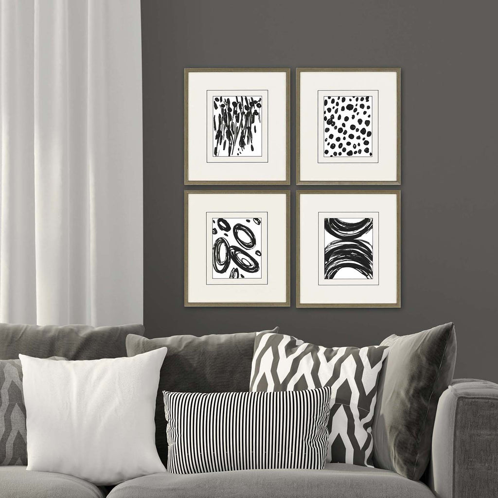 Black and white abstracts on fine art paper are matted in white. Framed in a sleek champagne gold wood molding. Sold as set of four.