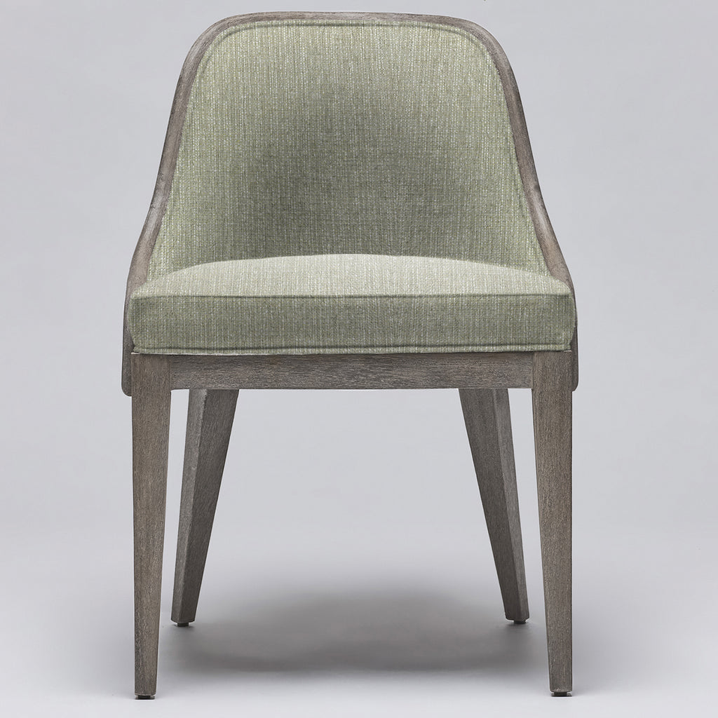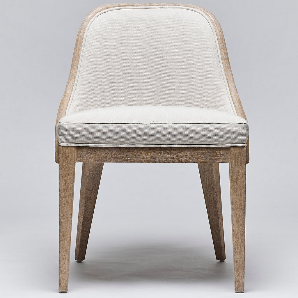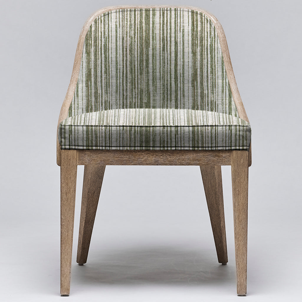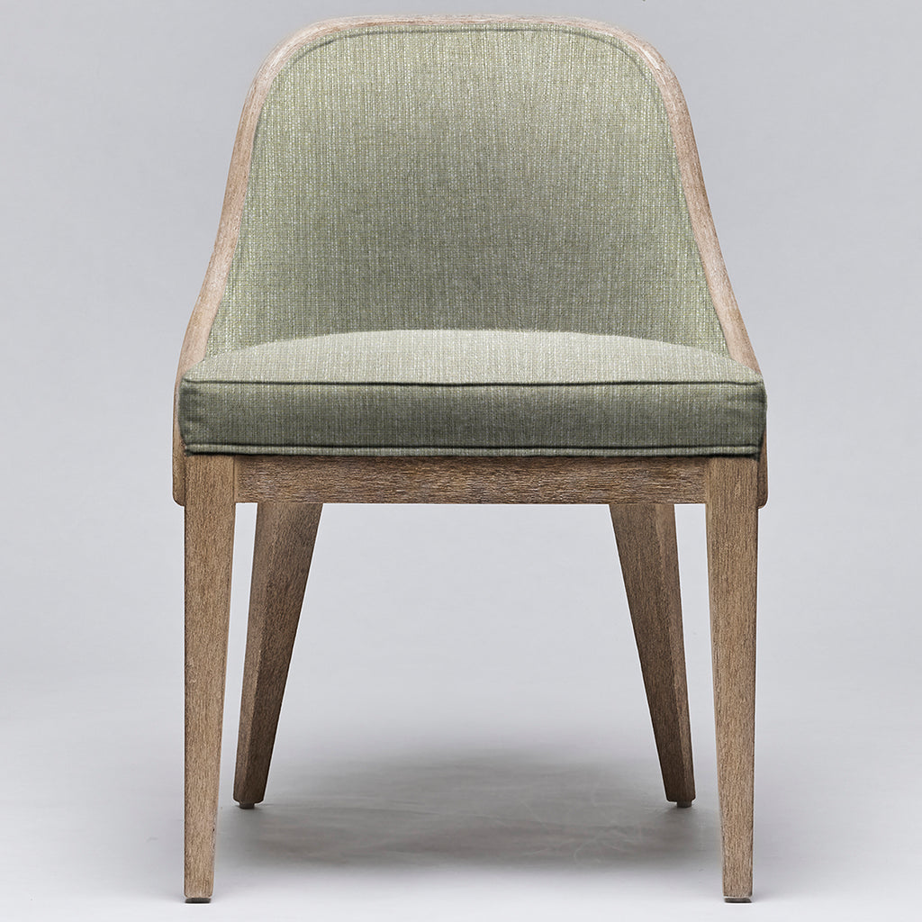 Bringing natural flair to an elegant seating option, the Siesta Dining Chair features raffia cane surrounding a grey ceruse mahogany frame.