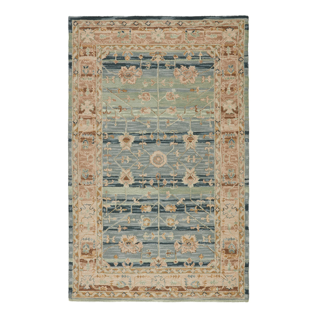 The hand-tufted Jaipur Cardamom collection boasts vivid jewel tones and uniquely distressed Turkish motifs, crafted to emulate traditional sun-faded, vintage designs. The Jensine rug showcases an open, vine motif in a mix of subdued hues of blue, green, beige, and light brown. Inspired by the artistic imperfection of dye-lot changes in perfectly aged wool textiles, the looped pile of this rug features tonal colorway depth and textural dimension.