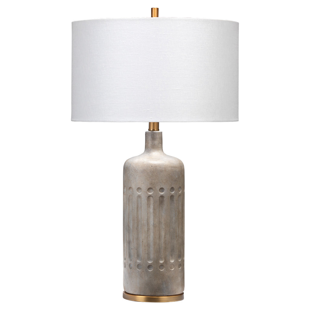 The Jamie Young Annex table lamp is the perfect addition to any casually modern space. The textured cement lamp body is accented with a subtle pattern that utilizes clean lines, while antiqued brass is used as a classic touch, to ground this piece. Paired with a white linen drum shade, this table lamp is striking in transitional to contemporary environments.