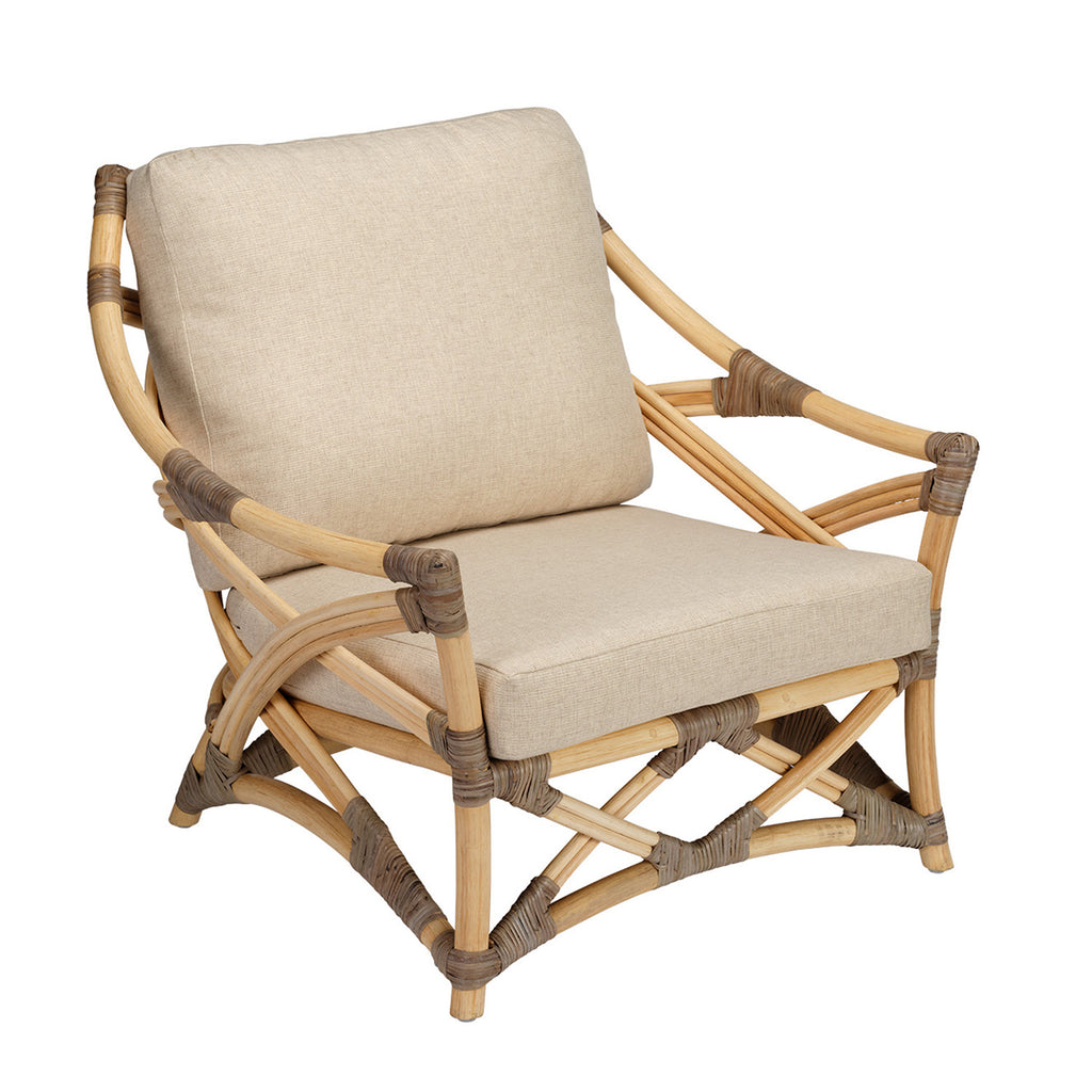Extravagantly wrapped rattan in contrasting finishes of matte grey and soft natural make up the back, sides, and base of this exuberant armchair. Never one to prioritize style over comfort, Jaime adds thick fluffy muslin cushions. Perfection!