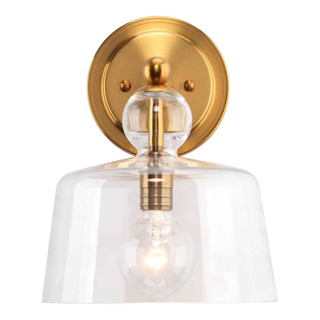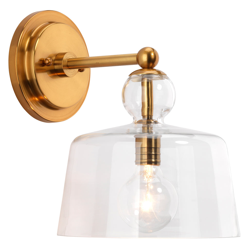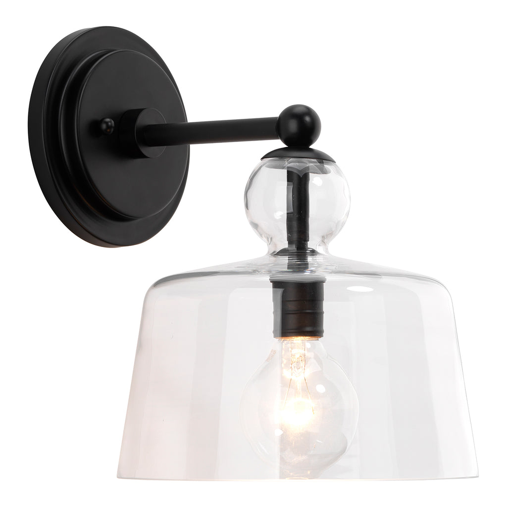Expert hand-craftmanship elevates the straightforward lines of this metal and glass wall sconce. The plate and arm are iron, and available in antiqued brass or matte black finishes. Due to the artisan crafted nature of these finishes, they may vary slightly from pictured. They may be installed as shown or can be inversed, and all mounting hardware is included.