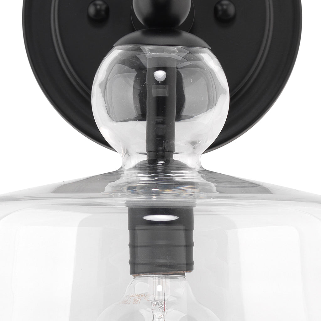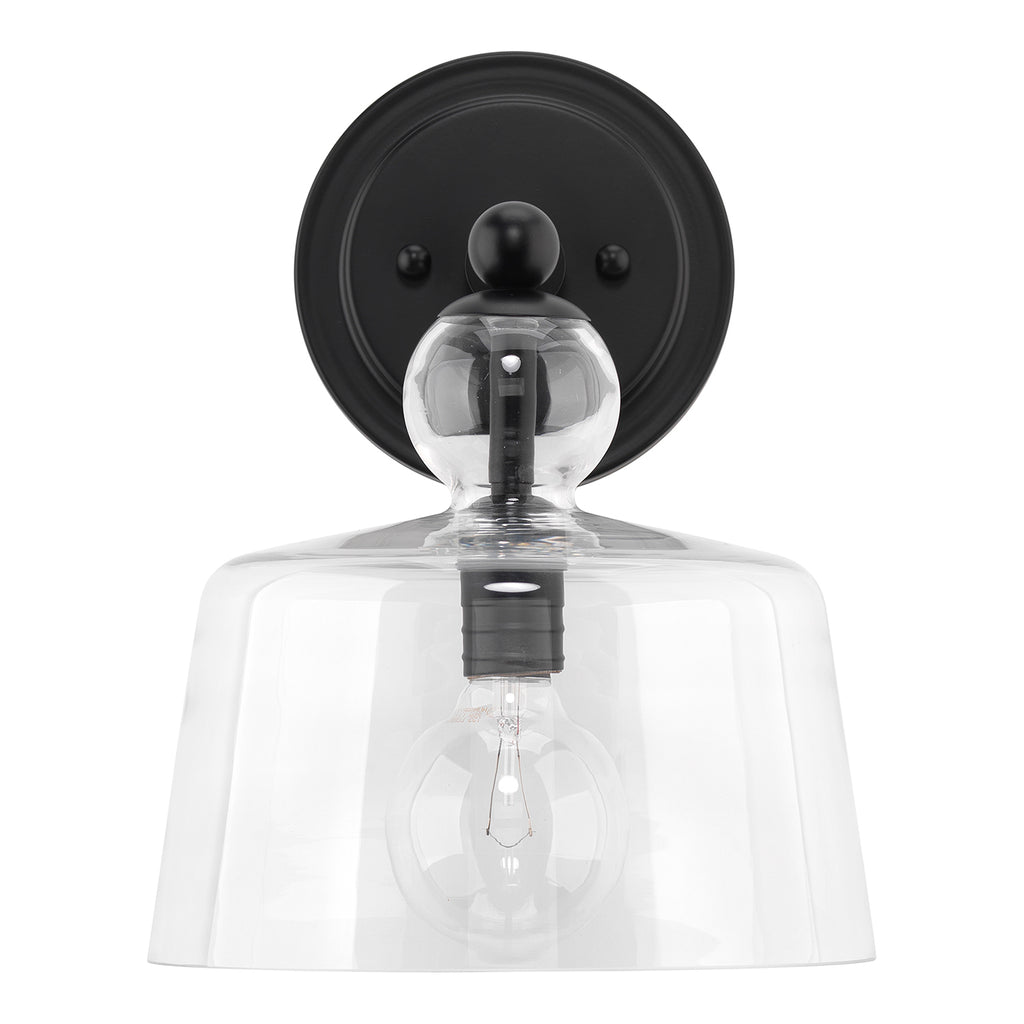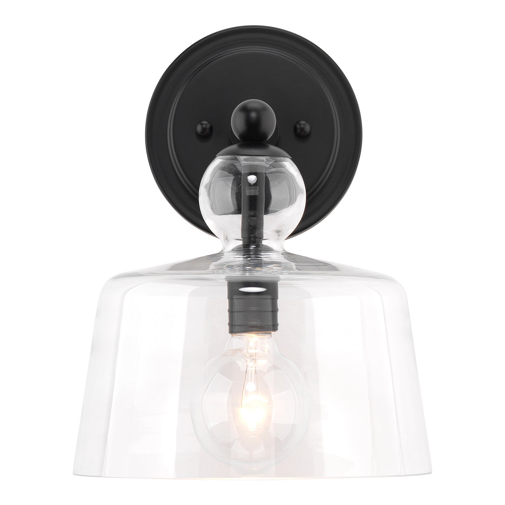 Expert hand-craftmanship elevates the straightforward lines of this metal and glass wall sconce. The plate and arm are iron, and available in antiqued brass or matte black finishes. Due to the artisan crafted nature of these finishes, they may vary slightly from pictured. They may be installed as shown or can be inversed, and all mounting hardware is included.