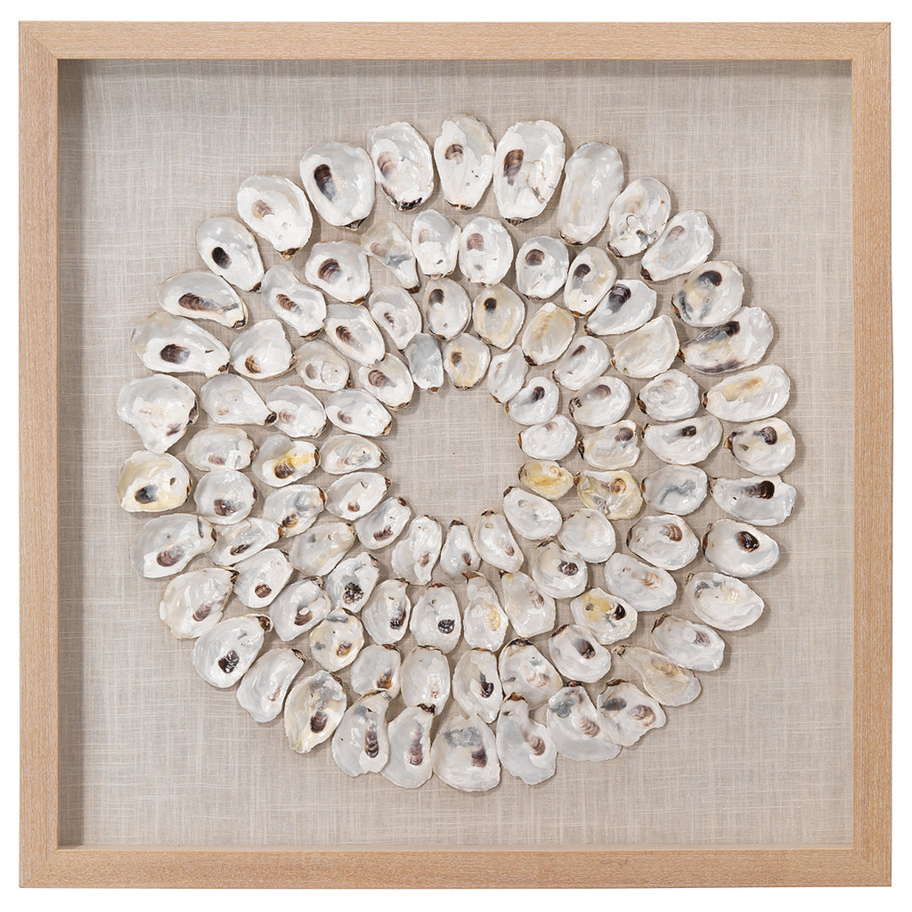 The Jamie Young Maldives wall art features a revolving pattern of unique shell shapes create a circular pattern of organic beauty. Natural colors and textures of radiate outward while drawing you into this stunner from the sea. As if this wall art piece washed ashore, specifically for your wall.
