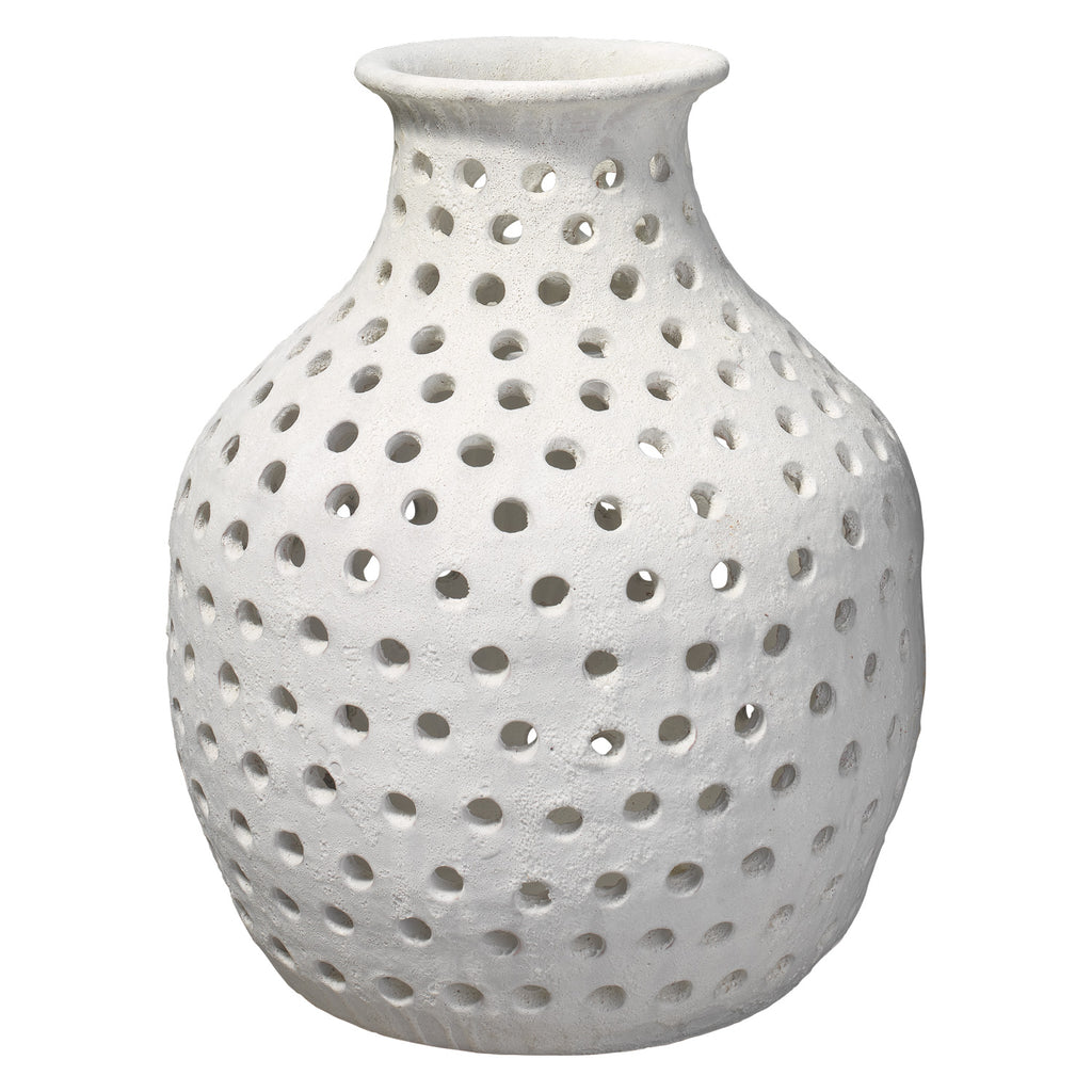 An uncommon pierced softly organic ceramic vase with a rustic white glaze.